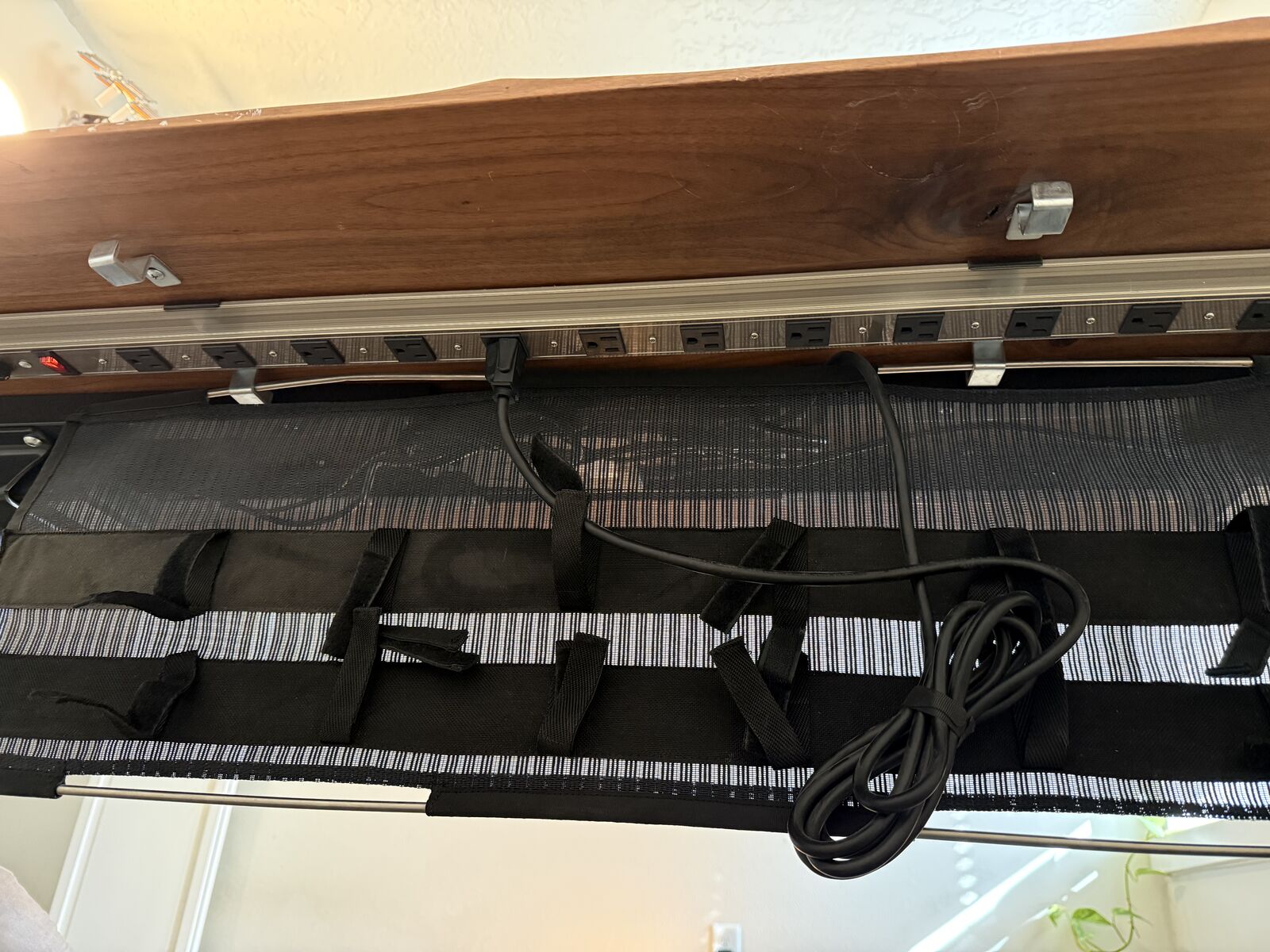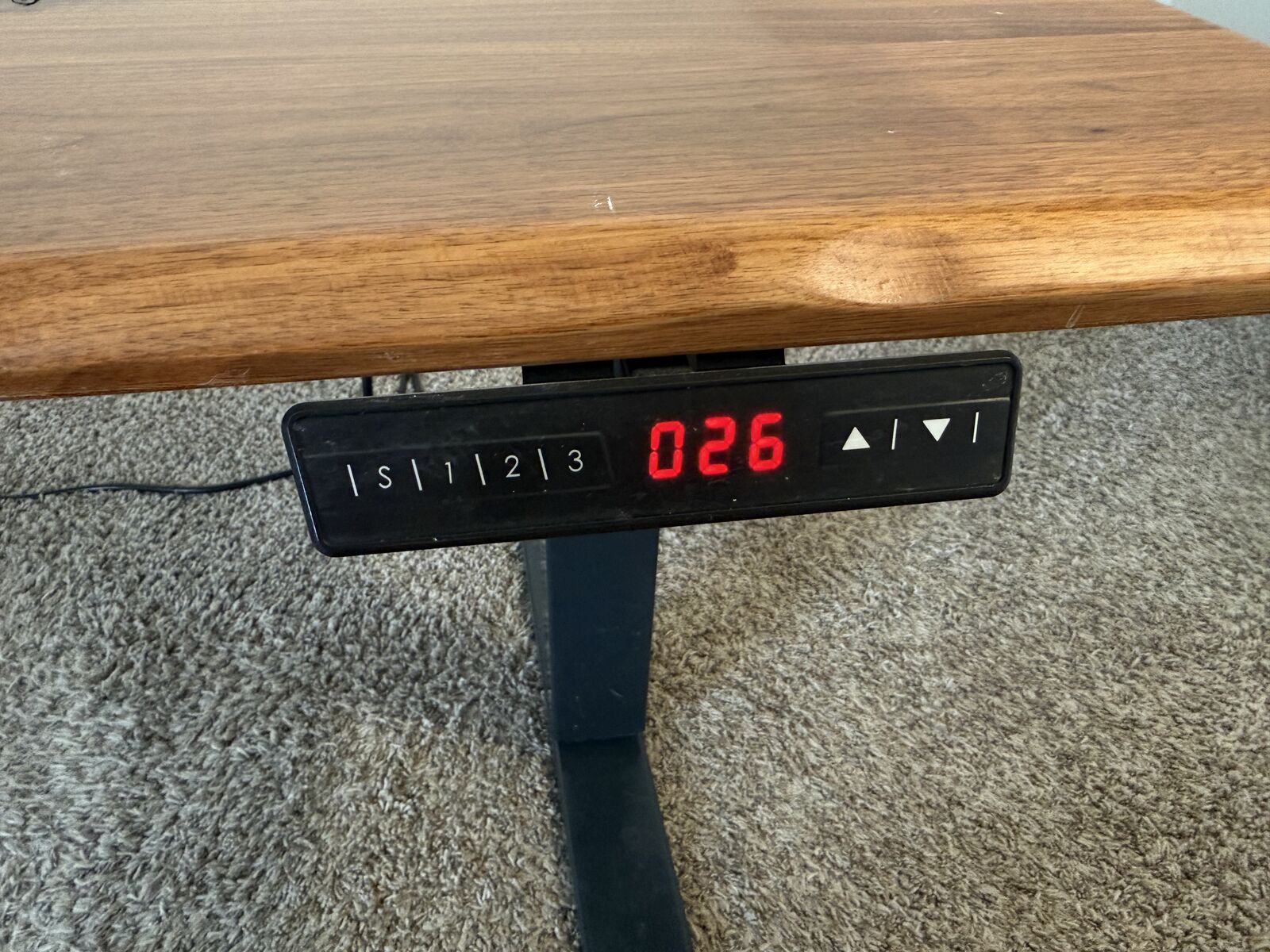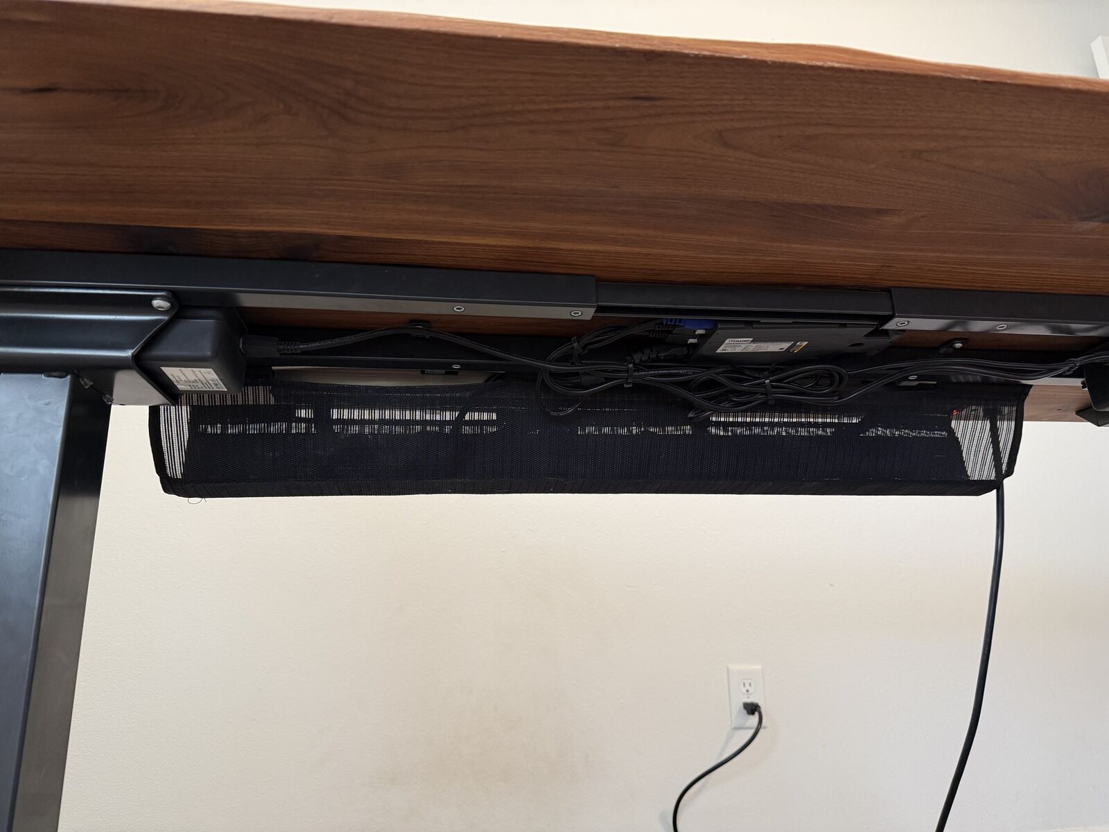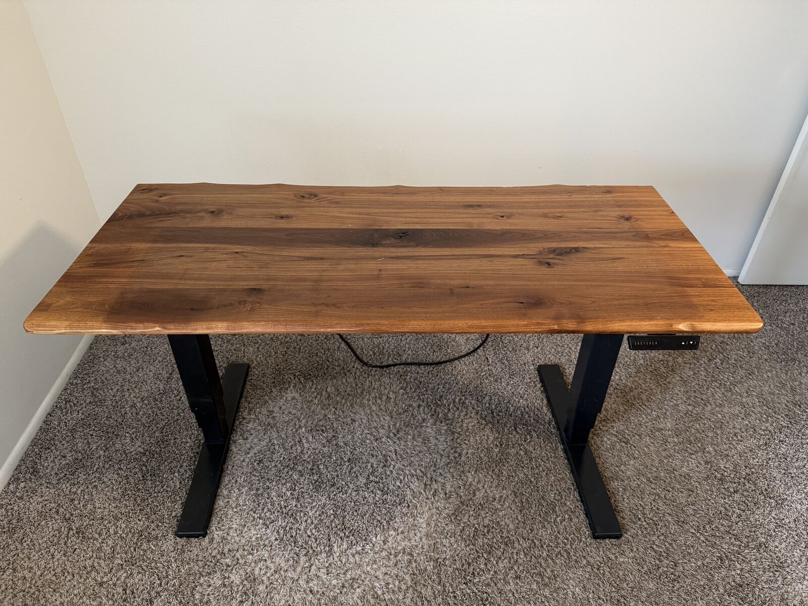 Selling my walnut top standing desk. The desk top measures 60x27. The desk will lower and raise from 26 to 51 inches with 3 programmable heights. Also included is the cable management tray and power strip. It is a mesh tray with velcro straps to secure power bricks and manage cables. It clips to the bottom of the desk and allows you to run a cable out wherever you want. It is super convenient.