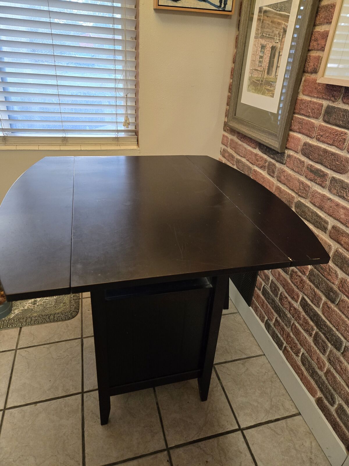 I'm doing some pre-spring cleaning so I'll be posting some stuff for Selling my dark wood drop-leaf wine table with built-in wine storage and 2 matching counter-height stools.matching counter-height stools.