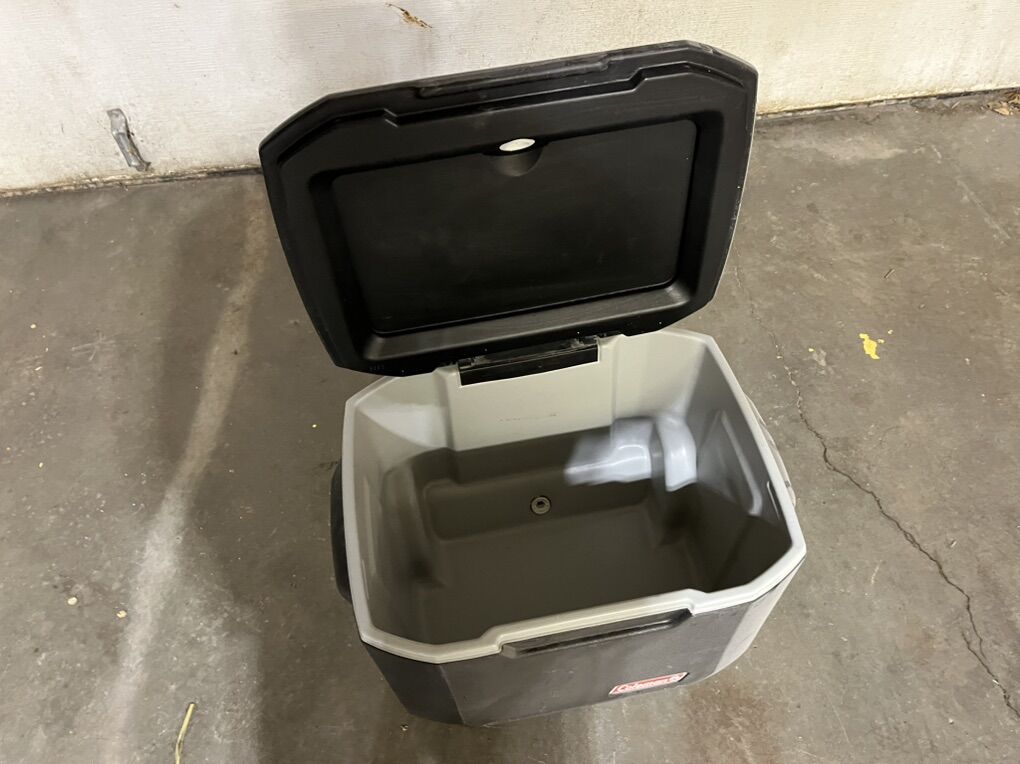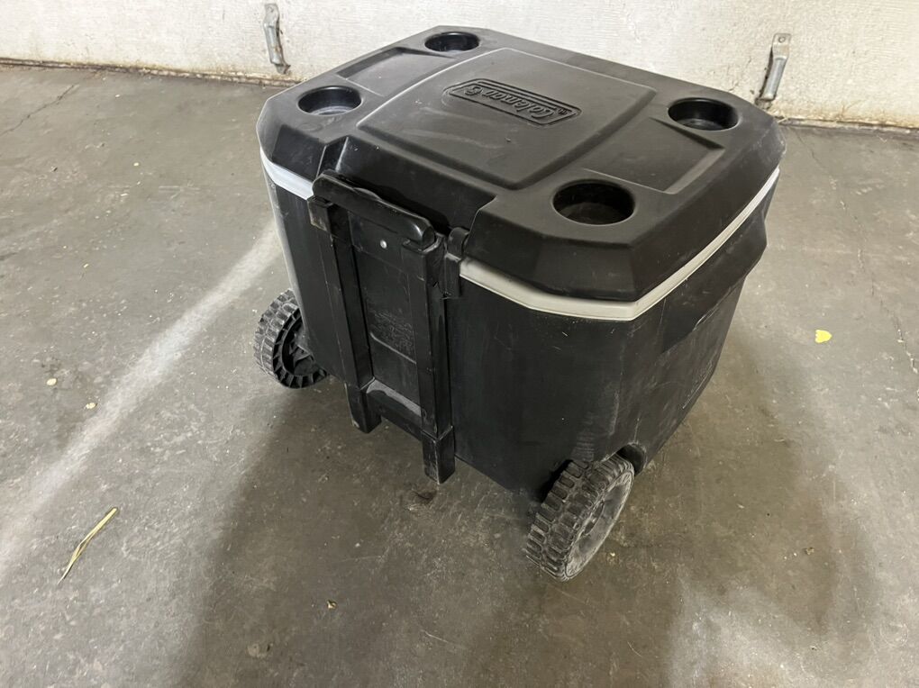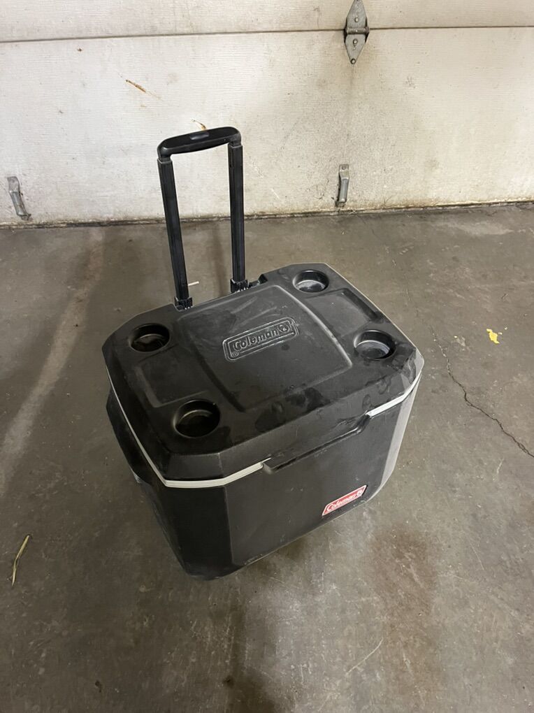 Coleman rolling cooler for sale! Everything works great and is in good condition, the only issue is that the wheel rod pops out sometimes.