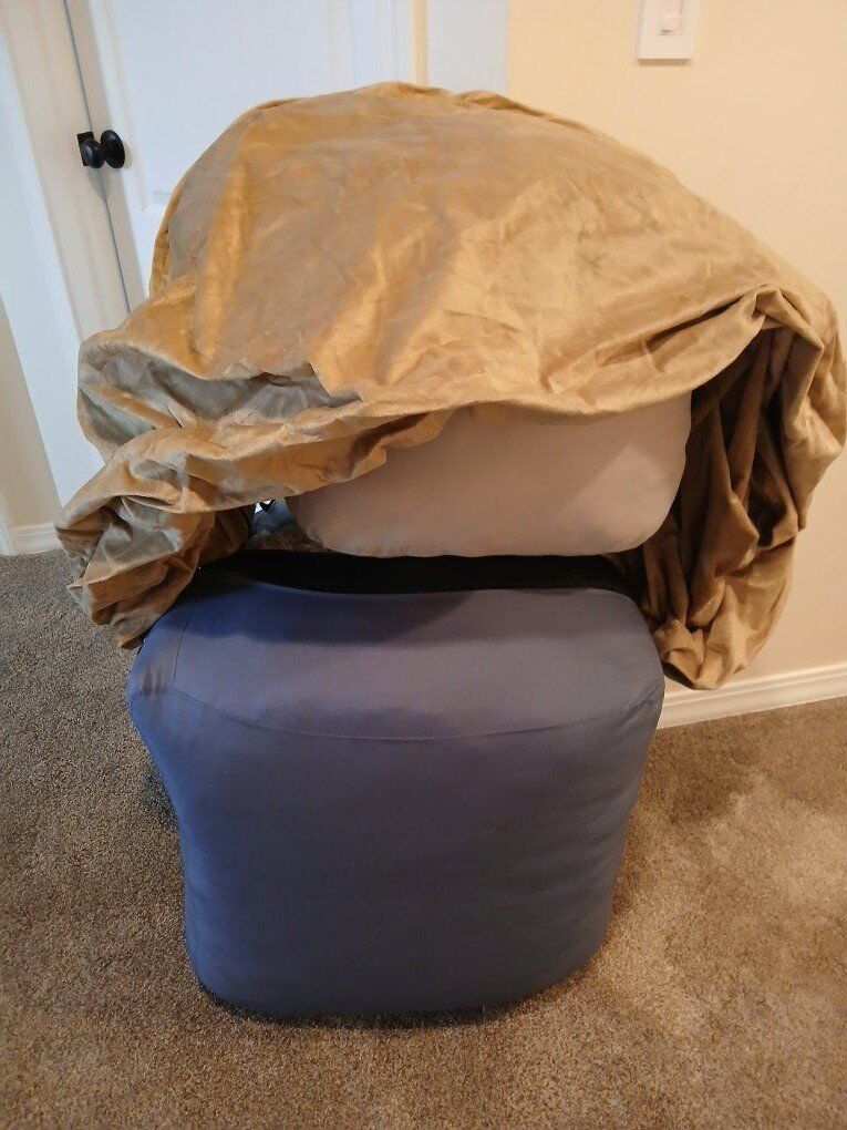 VenmoNew. Never opened, large beanbag 5ft. color is gold/tan. has extra fill in a separate container. memory foam. Clean home.