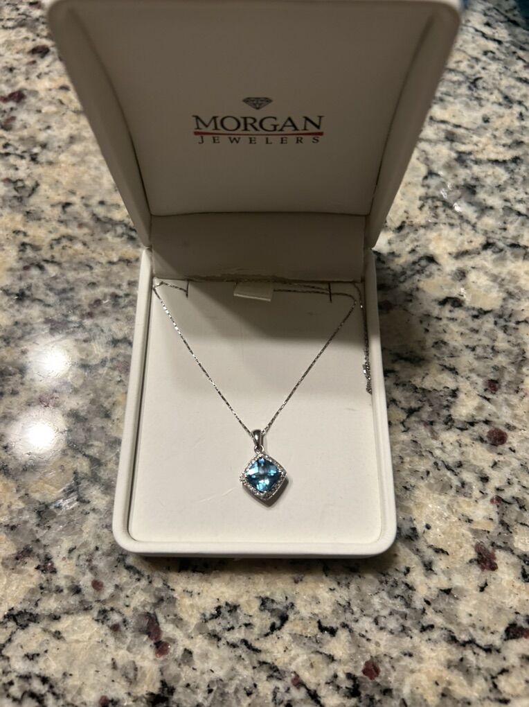 10 K white gold blue topaz diamond woman’s necklace with both boxes perfect condition. Necklace box has a little bit of wear and tear.