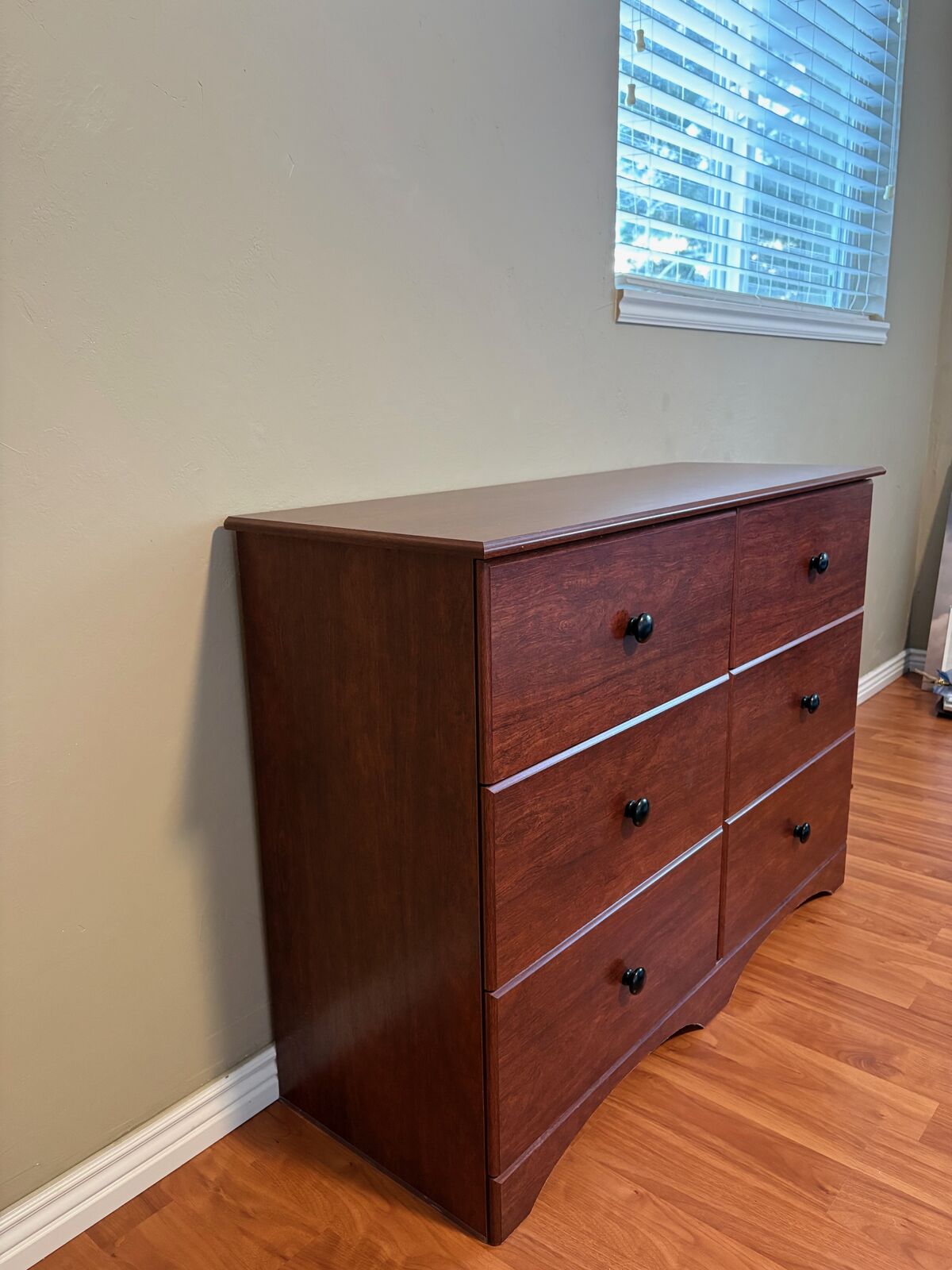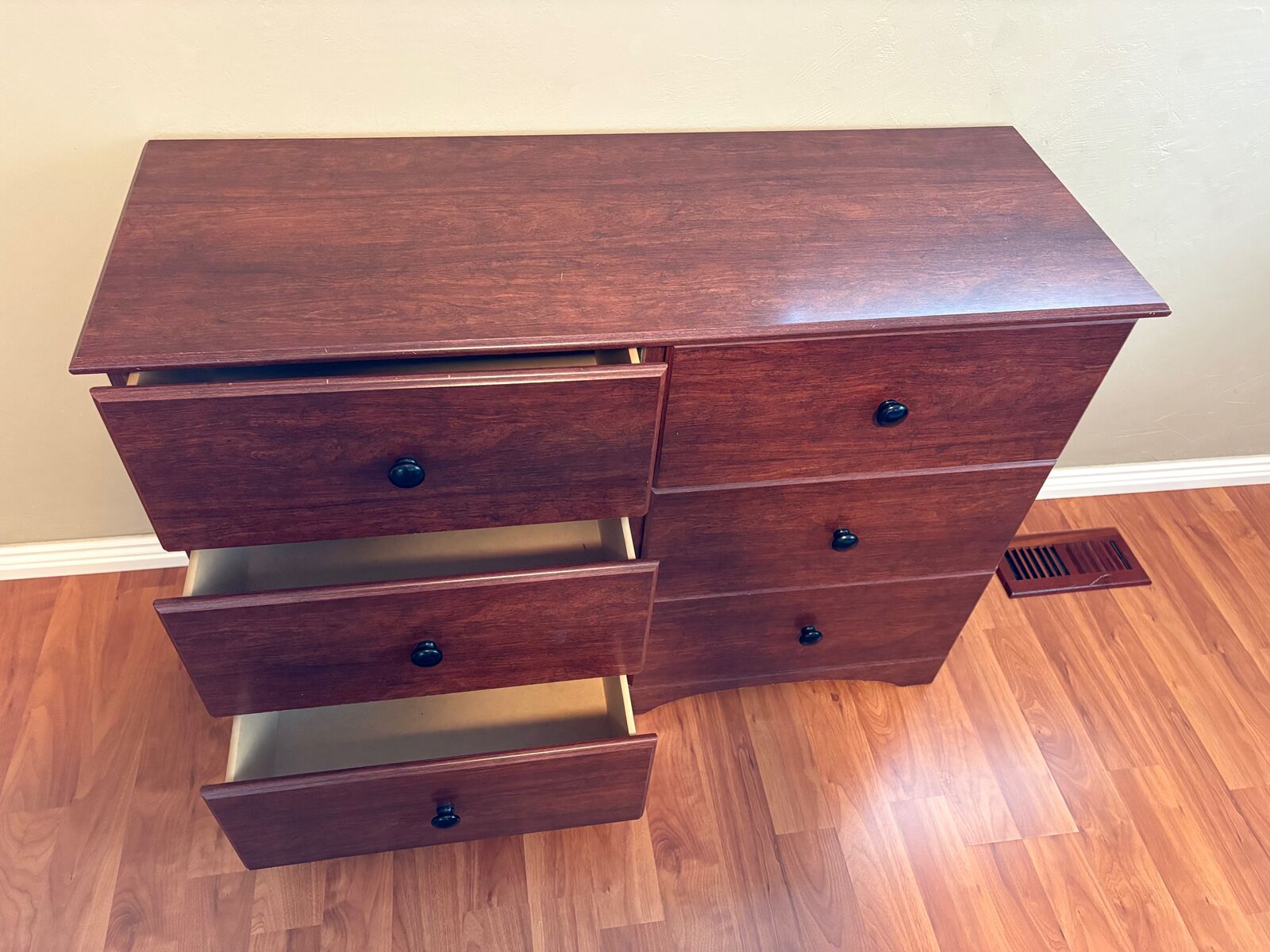 Faux Wood 6 Drawer Dresser. 32" tall x 16" deep x 44.5" wide.