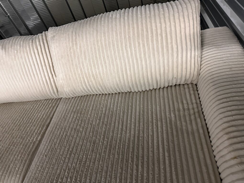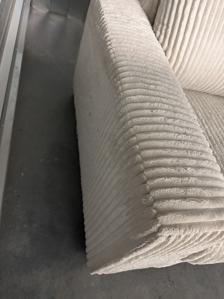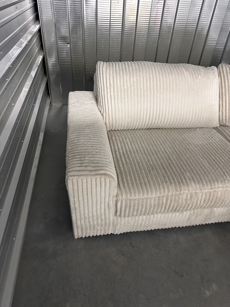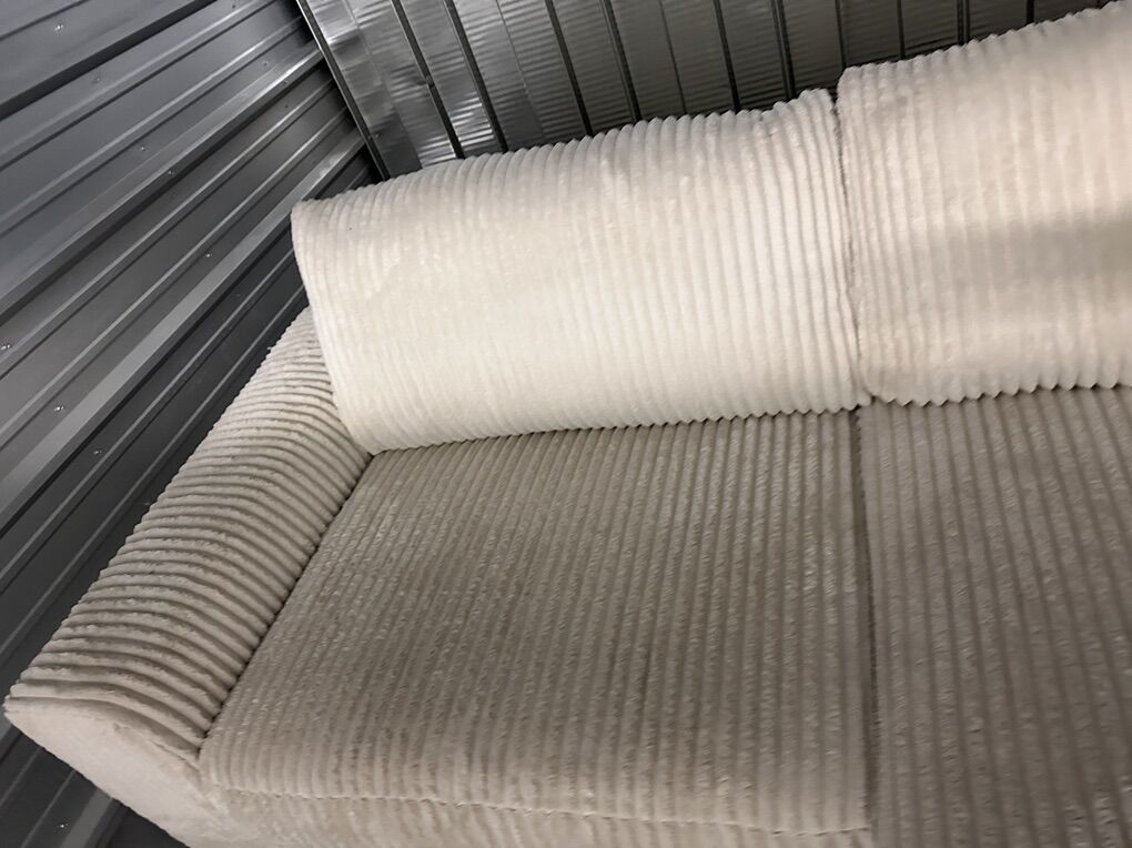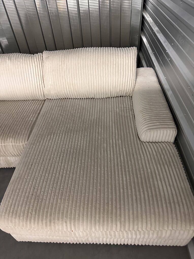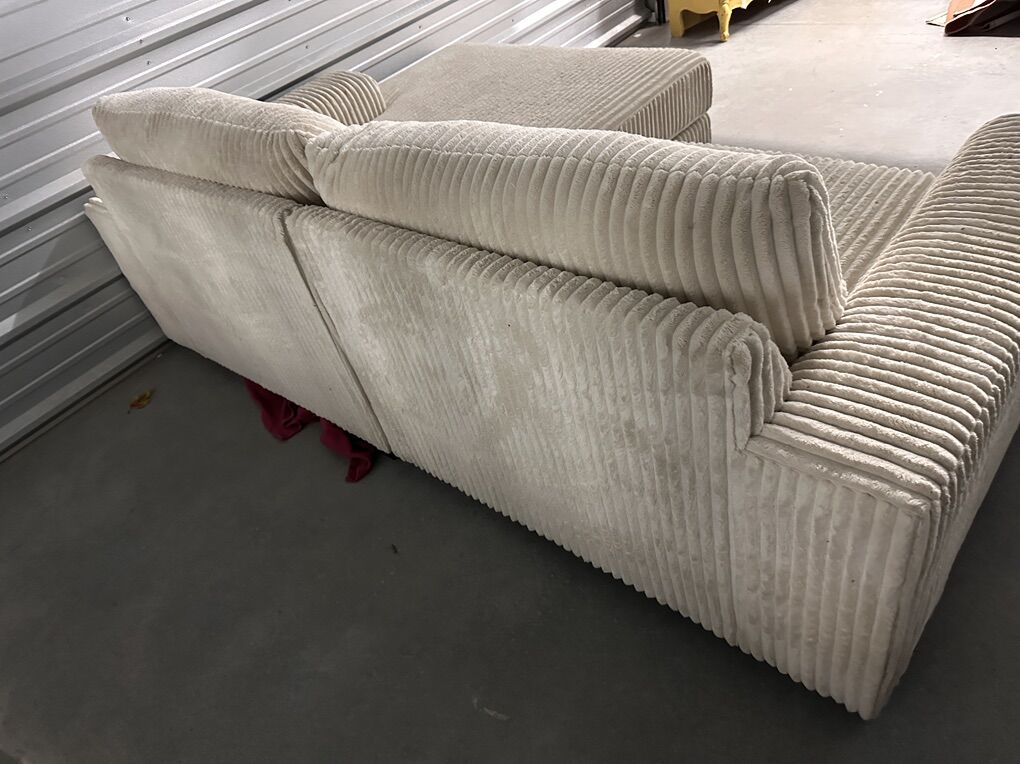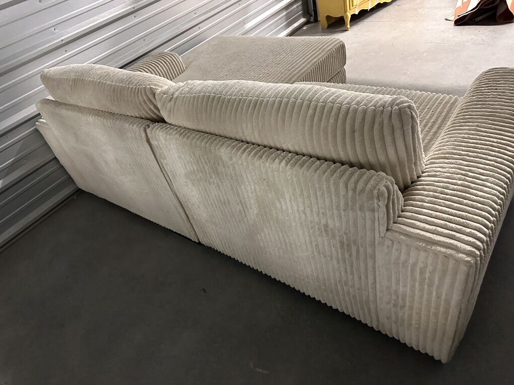 VenmoModern and comfortable Ashley Furniture sectional in a soft cream corduroy fabric. Deep seating with a wide chaise. Clean and supportive.