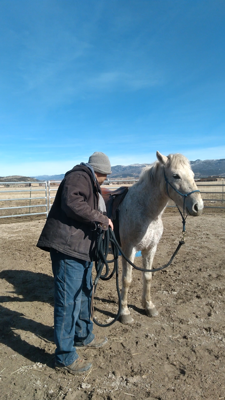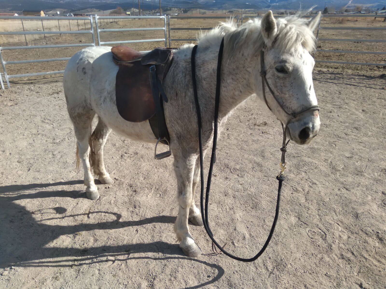 Got her from rescue. Saddle, lead, trimmed front feet.