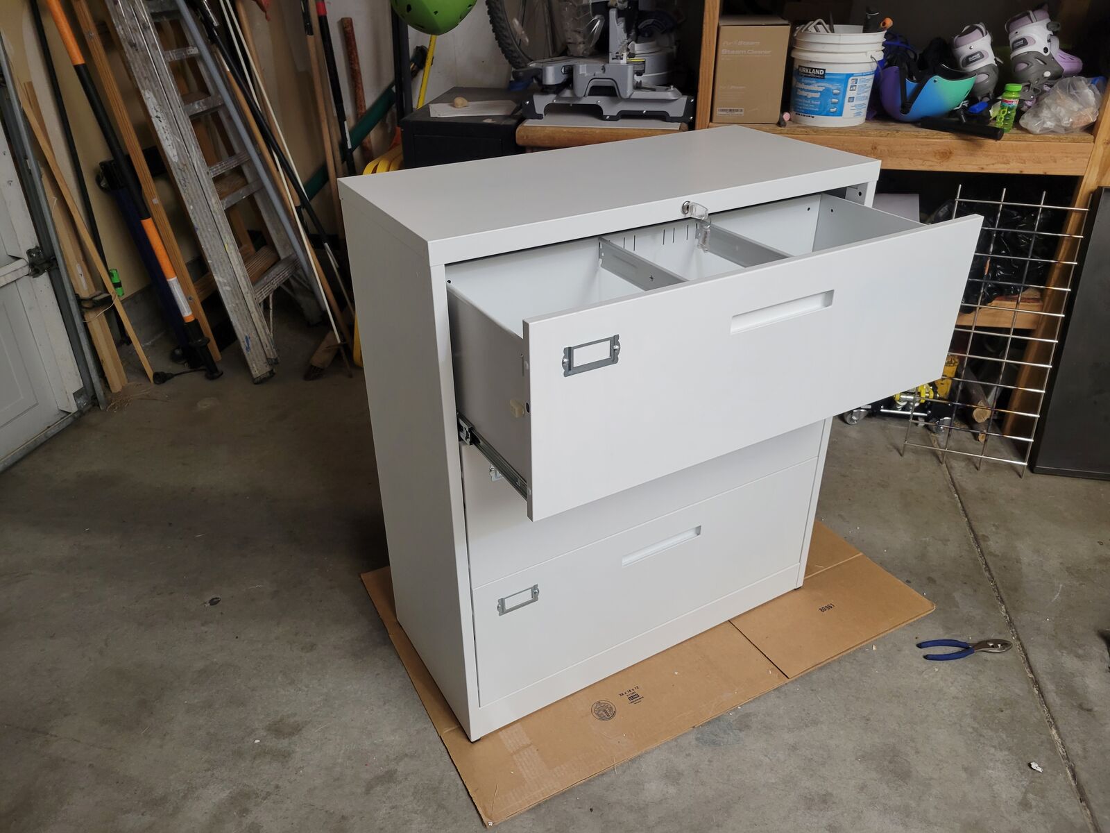 ZelleBrand new 3 drawer filing cabinet with Lock. Never been used. Out of the box and fully assembled with the key. 40" tall, 35" wide and 16" deep.