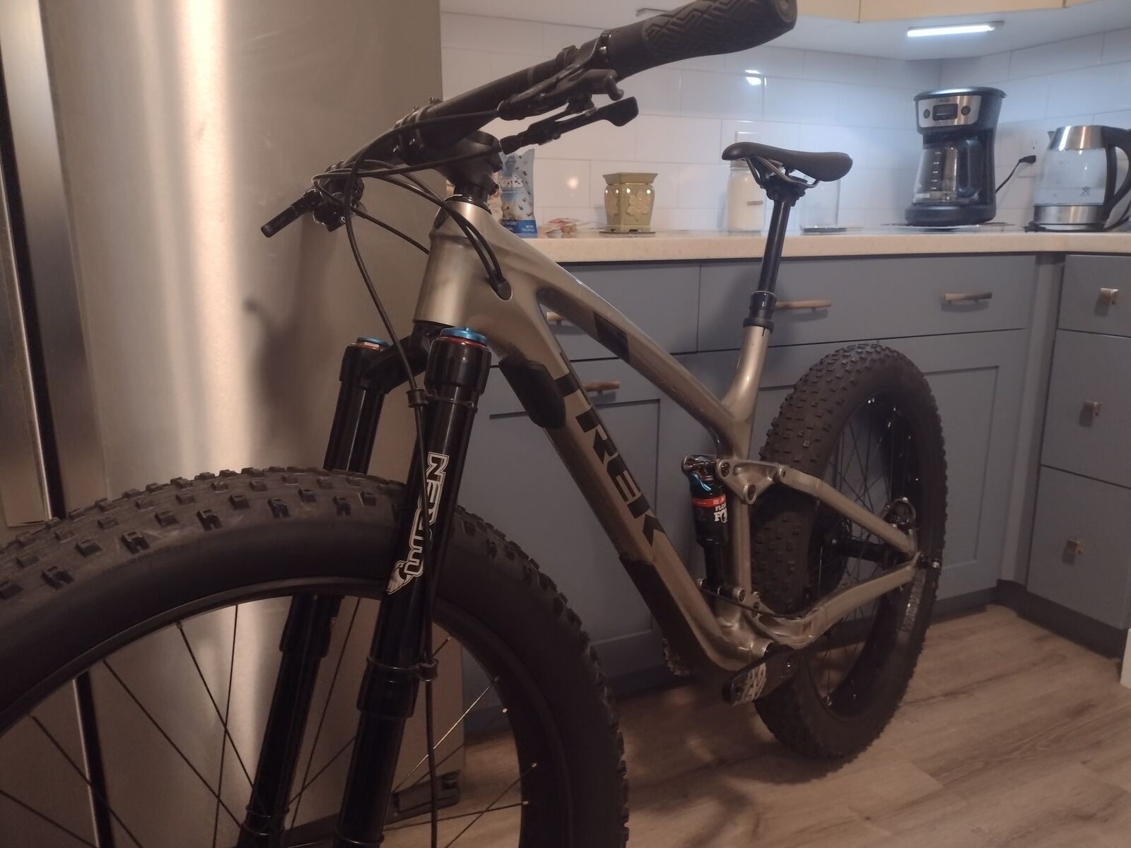 2021 Farley EX size Large carbon full suspension fatbike in excellent condition with very few miles, built frame up with a 2021 frameset (120mm travel)purchased new at the end of 2020. (The Farley EX was offered as a frameset only from 2019-2022)All components used for the build were new at the time of the build. Carbon Wompa rims with 27.5x4.0" rear and 4.5" front tires set up tubeless. Wren inverted fork-110 mm travel. TRP Spyke dual piston mechanical disc brakes. Sram GX drive train with 165 mm cranks. Line Pro dropper post. Also have a pair of custom built very light RaceFace Carbon wheels with 2.8 " tires and very little use that I would add for an additional $500(bike weighs about 32.5 pounds with the Race Face wheels installed) . Kept in indoors. Would rather keep the bike than accept lowball offers.