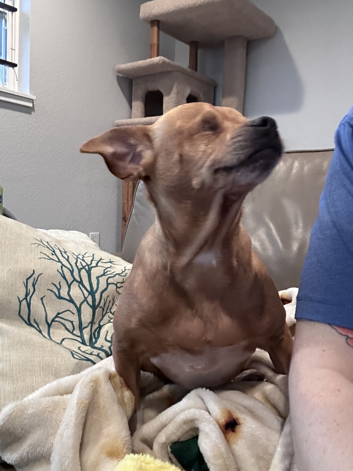Betty has learned how to navigate her new foster home with all of the rugs that are laid out. She also has become very affectionate and sweet. She loves to snuggle on the couch with you and lay her head on your lap. She will also occasionally play with toys when she is feeling a little rowdy and playful. She does give some play nibbles when she is excited, but that’s how she explores her world, and it’s never a really hard or serious nibble.