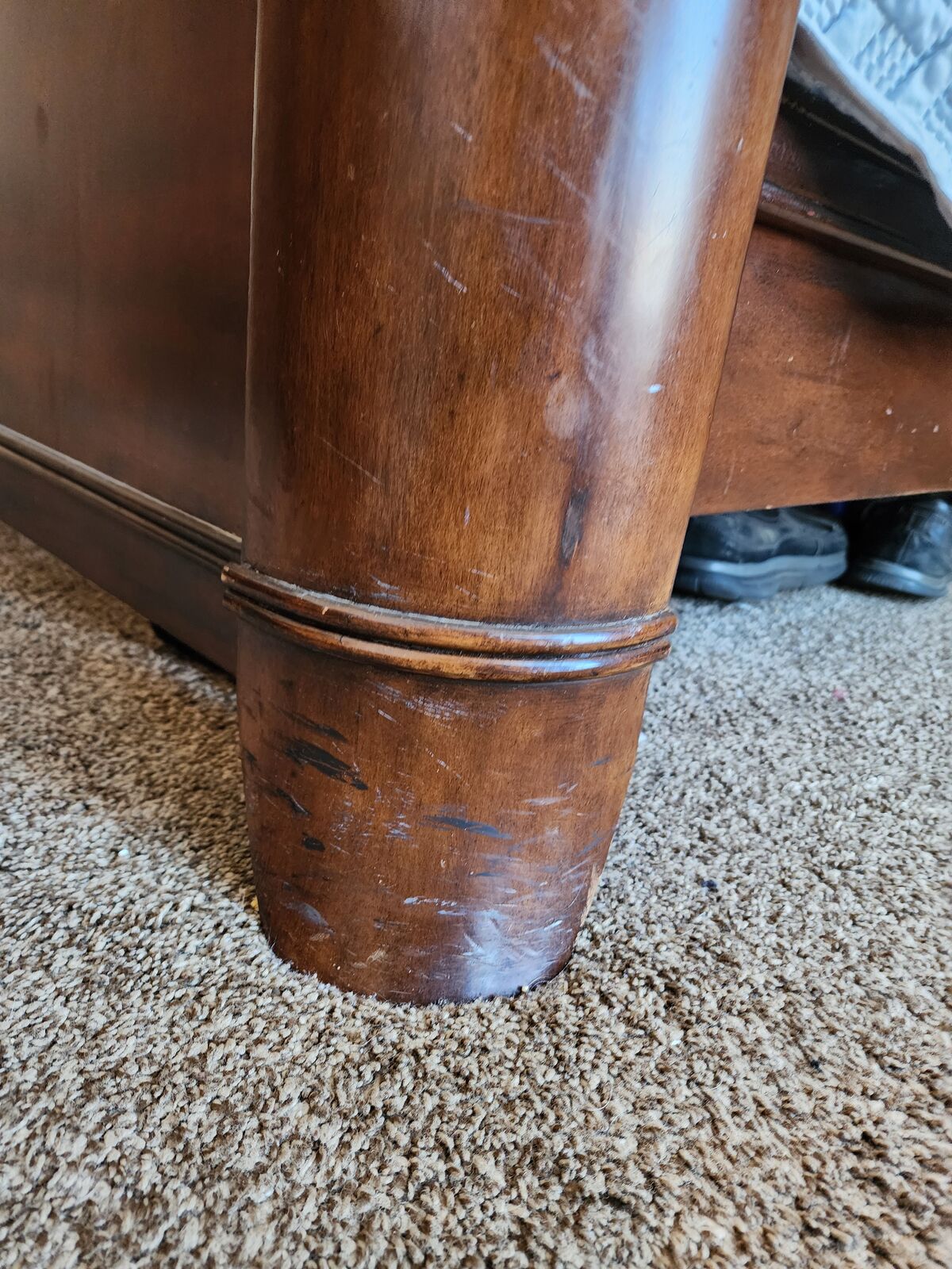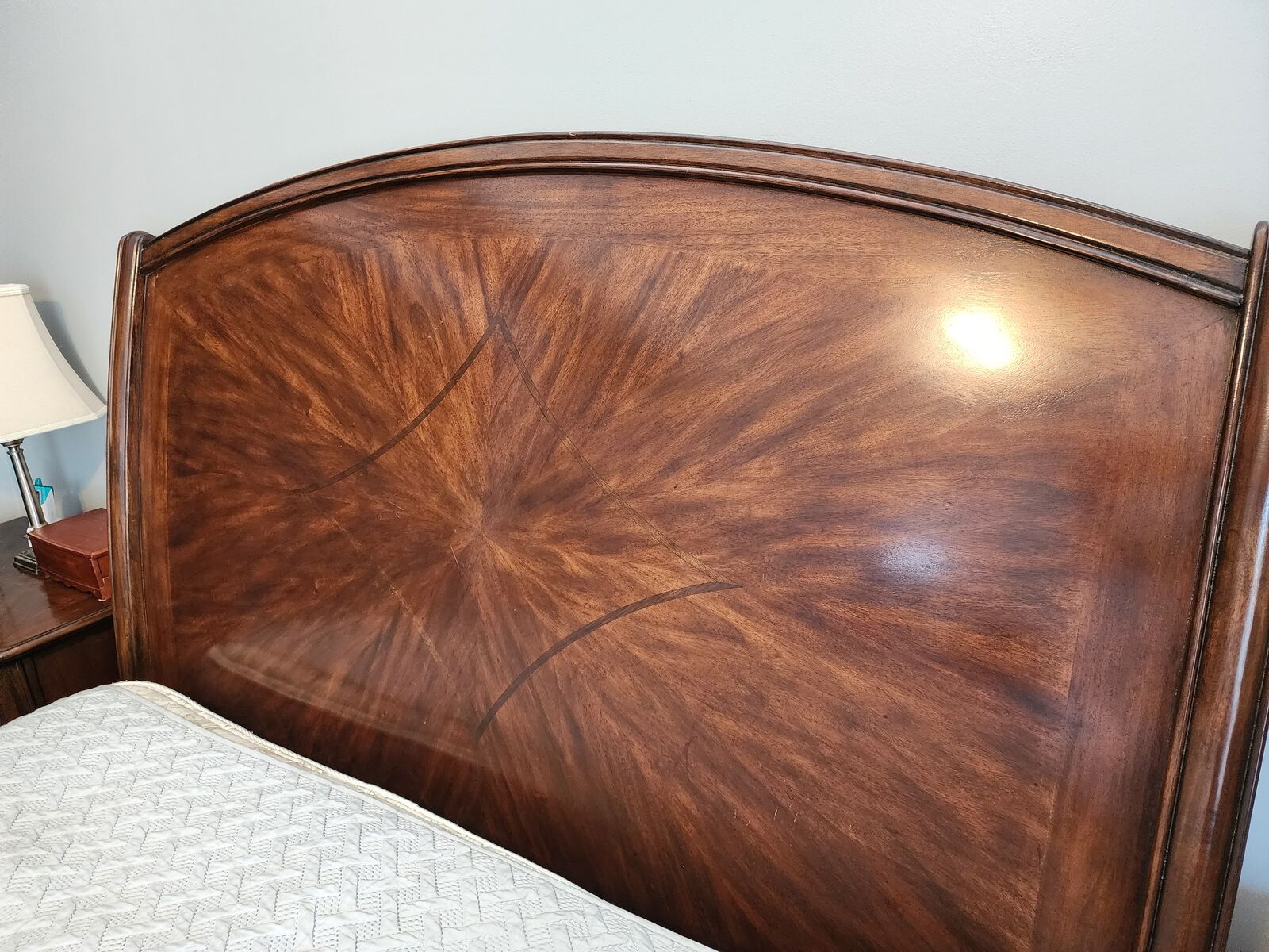 It's made of solid hard wood (species unknown) with a beautiful starburst design and inlay in the headboard. It's in good shape with just a few dings to the finish along the feet (see photos). It comes from a pest and smoke free home.