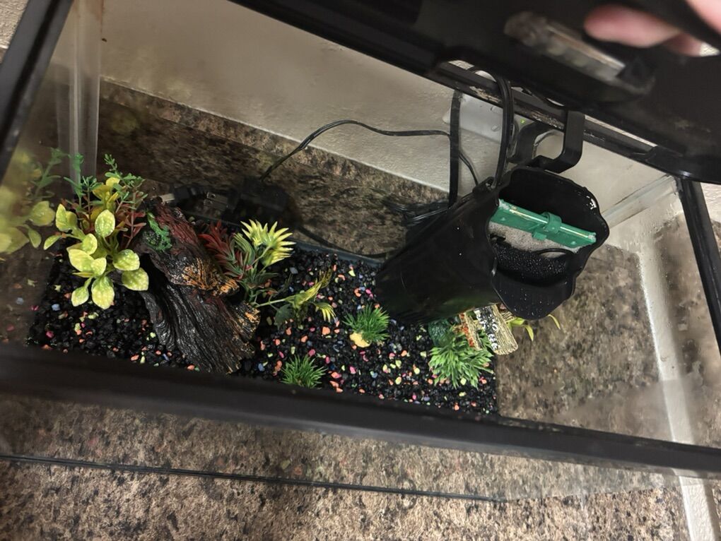 Comes with .. Tank + filter ( w/ new cartridge) + lid w/ LED lights + rocks & decor