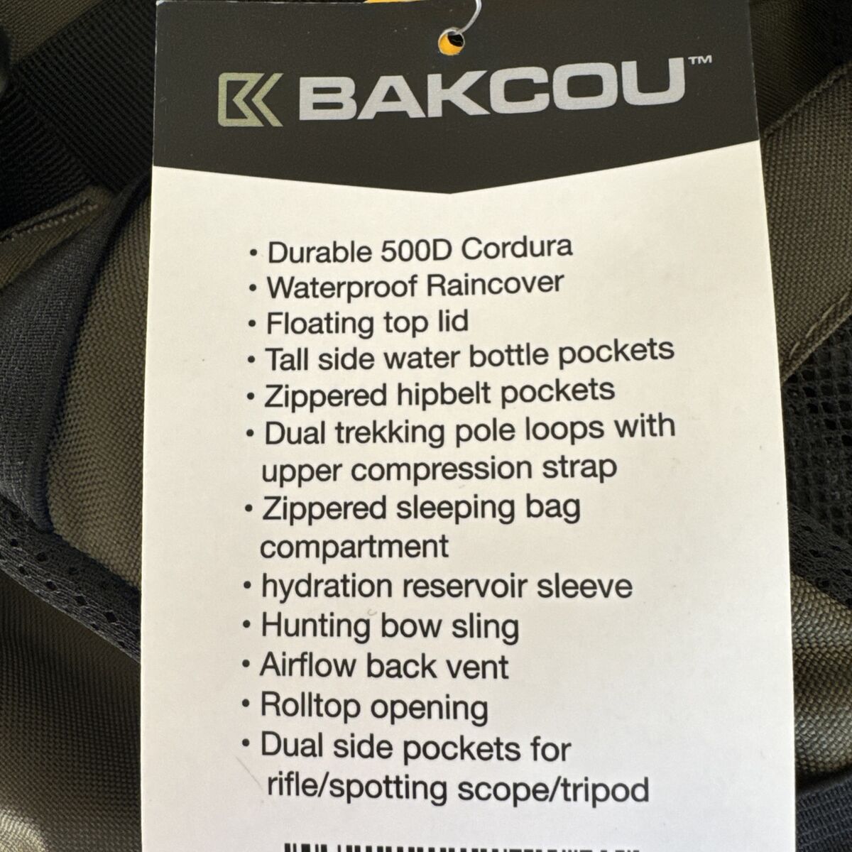 Venmo• Durable 500D Cordura • Waterproof Raincover • Floating top lid • Tall side water bottle pockets • Zippered hipbelt pockets • Dual trekking pole loops with upper compression strap • Zippered sleeping bag compartment • hydration reservoir sleeve • Hunting bow sling • Airflow back vent • Rolltop opening • Dual side pockets for rifle/spotting scope/tripod