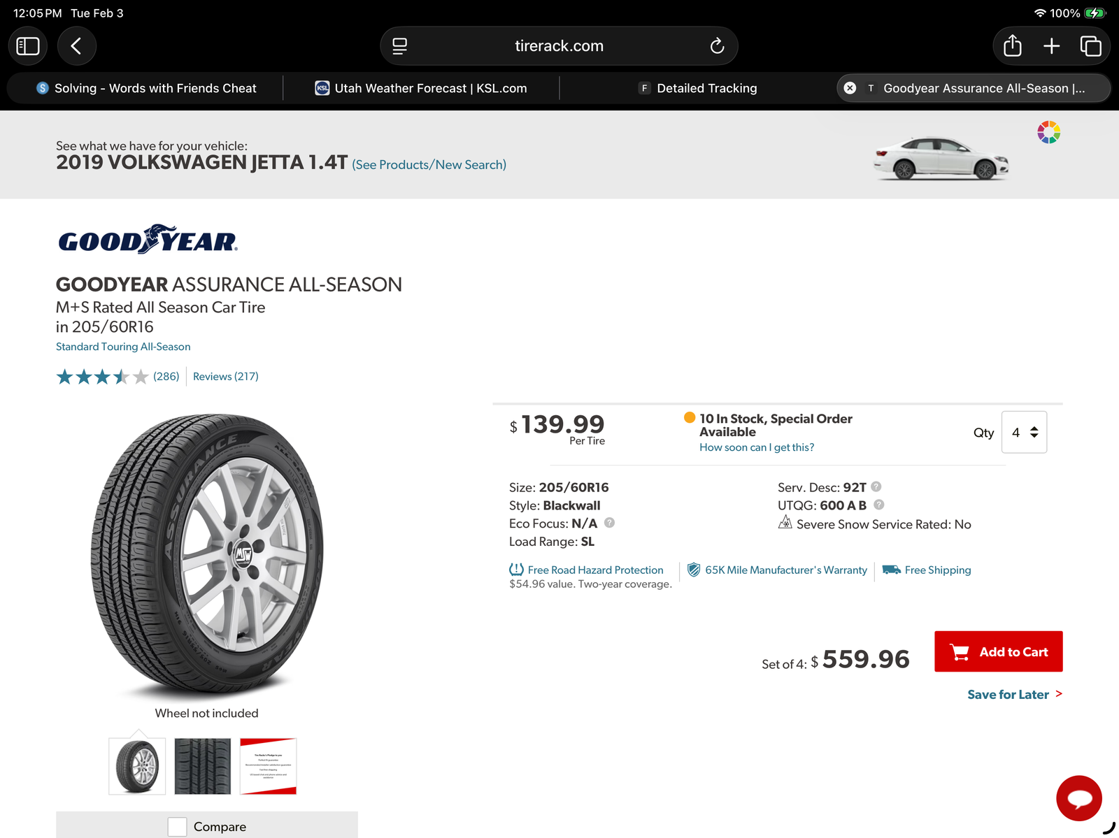 VenmoSet of 4 Goodyear Assurance All-Season tires in excellent condition. Size: 205/60R16 Only ~3,000 miles driven Tread depth: ~10/32 (near new) No patches, plugs, or damage Even wear on all tires These came off a 2019 VW Jetta and ride smooth and quiet. I had a separate set of winter tires on the car when it was totaled a month ago, so these were removed beforehand and were not involved in the accident. They’ve been stored in my garage since and are in like-new condition. New price is about $560 for the set. Located in Sandy (84092). Message me if interested!
