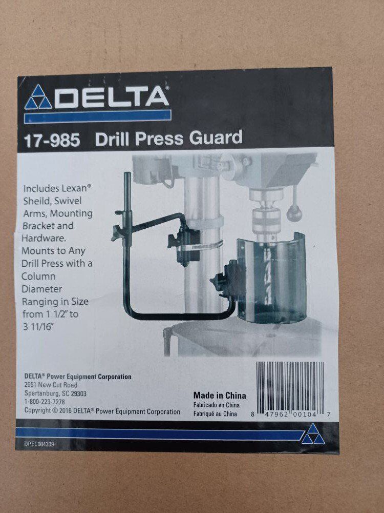 DELTA Drill Press Guard Model 17-985 New in sealed box: Includes lexan shield, swivel arms, Mounting bracket and hardware. Mounts to any full press with a column ranging in size from 1 1/2" to 3 11/16" New in sealed box. FCFS Cash accepted.