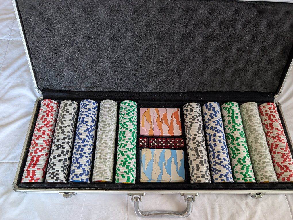 VenmoCheck out my Simpson's Poker Chips Set. Complete. This set is not even open all the way. Never been used. 2005 Simpsons Holiday gift (17th seasons) to cast/crew not available in any store. 500 still sealed chips with 100 of each of 5 family members-Homer black chips, Bart green chips, Lisa red chips, Marge blue chips and Baby grey chips. Homer is the face of each King, Marge of each Queen, Bart of each Jack, with the boss on the Ace of Spades. Case is is 22-1/4" x 8" x 2-3/4"Weighs 18 pounds in padded aluminum locking case with dice, and two decks of cards.