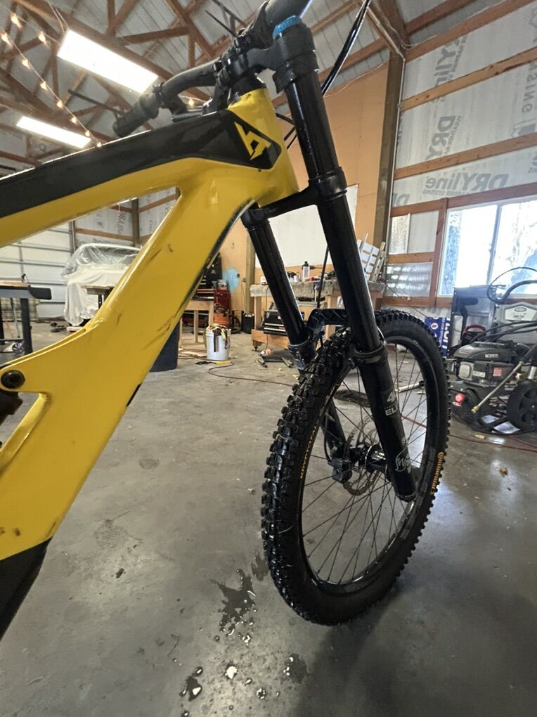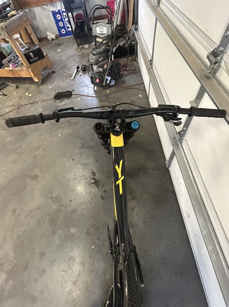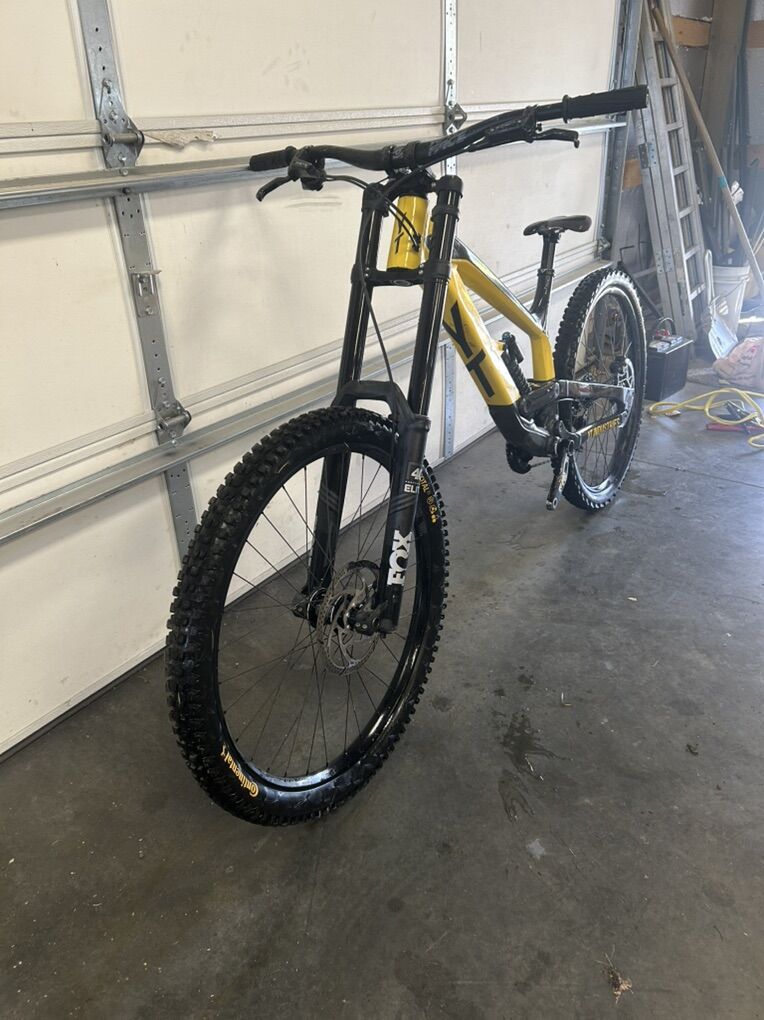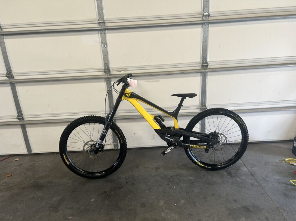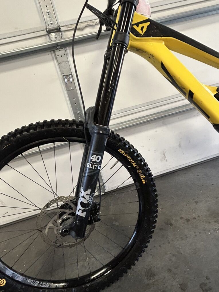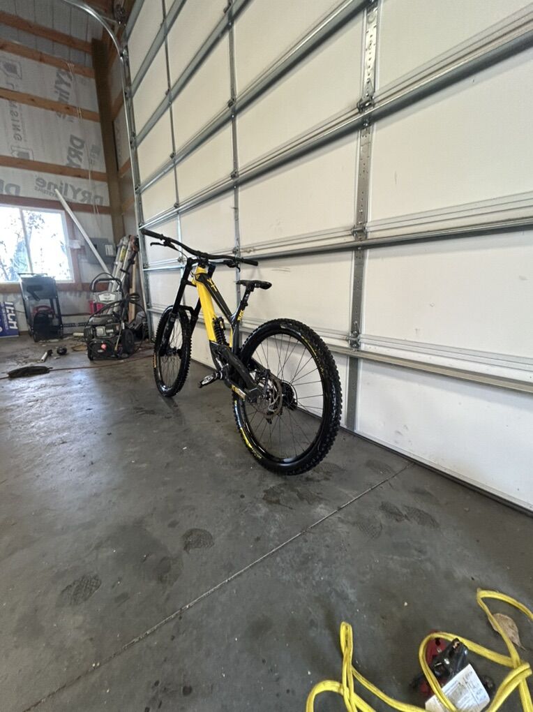 Size XL but runs small I’m 6’0” flat and it fits me perfectly. I bought it used and have only ridden it a handful of times at park. The 27.5 wheels allow for a playful time while 200 mm of travel front and rear lets it eat up anything. It does have scratches due to a washout and some things the previous owner has done but it’s all cosmetic and quite frankly it looks really good but with the scratches you don’t have to worry about it like you would a new bike. It’s the ultimate bike to ride hard and have a blast on. Does have ride wrap installed. Fox 36 performance fork Fox Coil rear Gx drivetrain TRP brakes