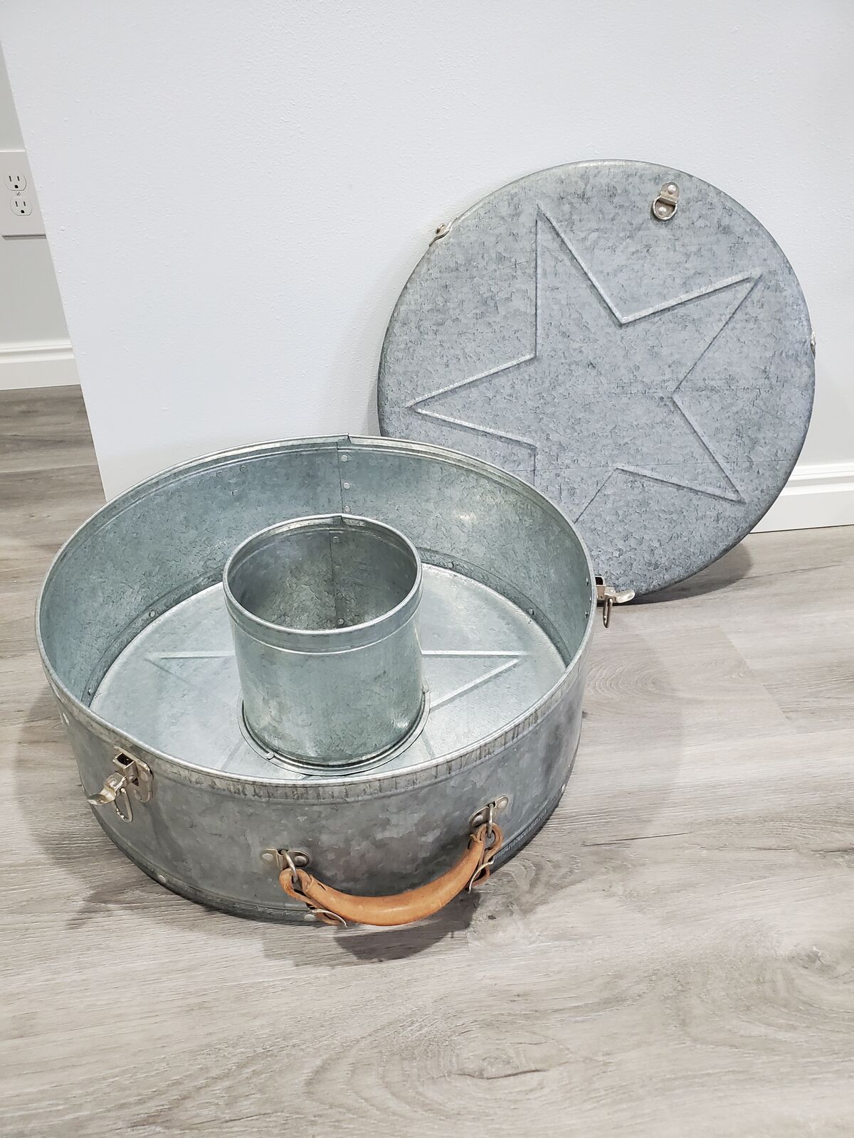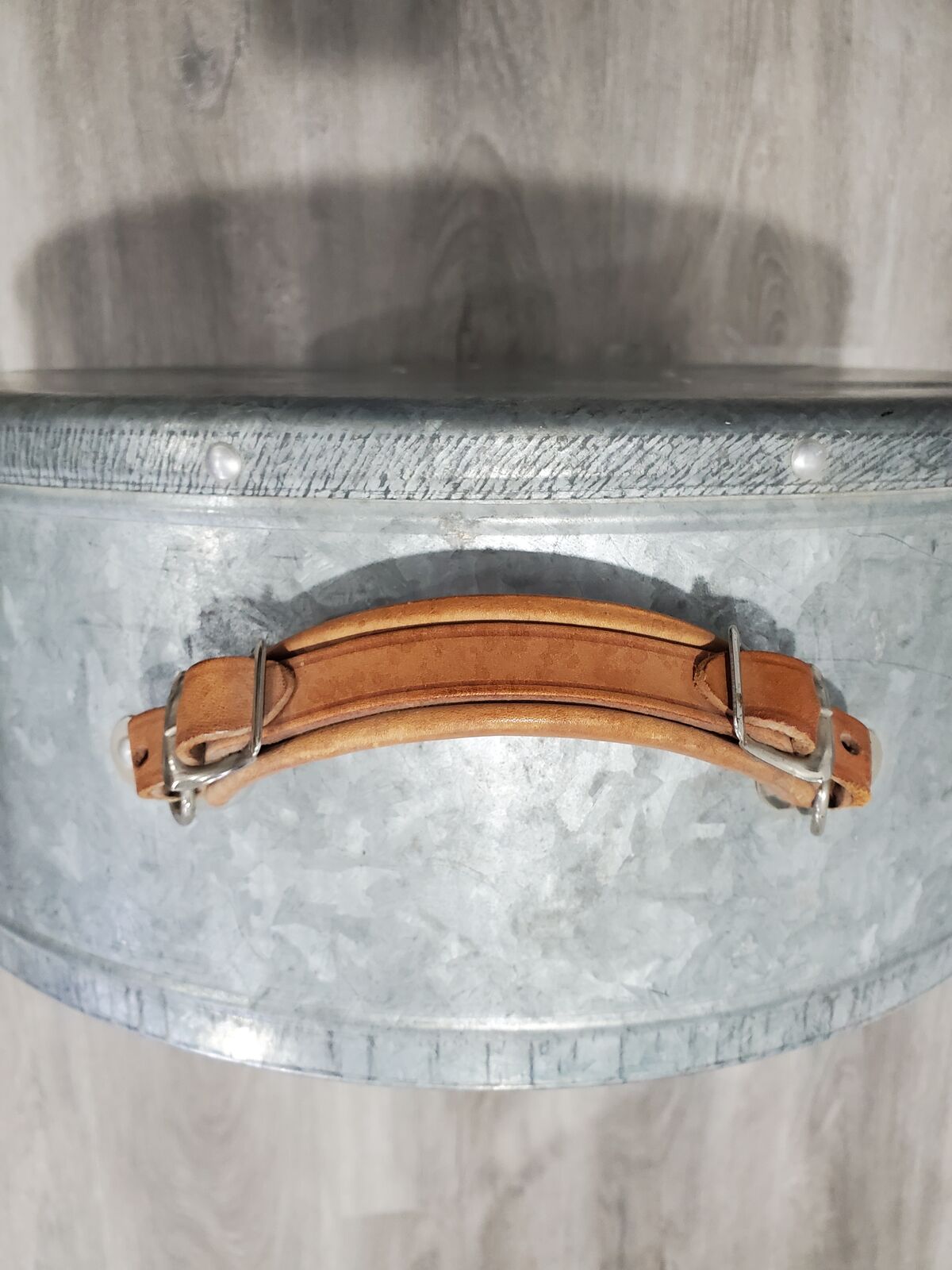 Nice leather handle. Would make a great display piece. Measures 18 inches in diameter and 6.75 inches deep.
