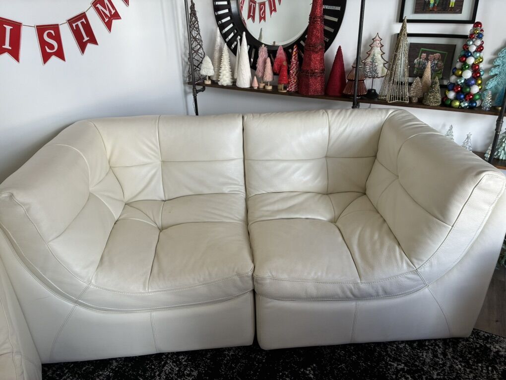 VenmoFor sale are four pieces of gently used white leather furniture that can be configured as two loveseats or four individual chairs. The leather is in excellent condition, with minimal signs of wear. The pieces are versatile and can be arranged to fit any room layout.