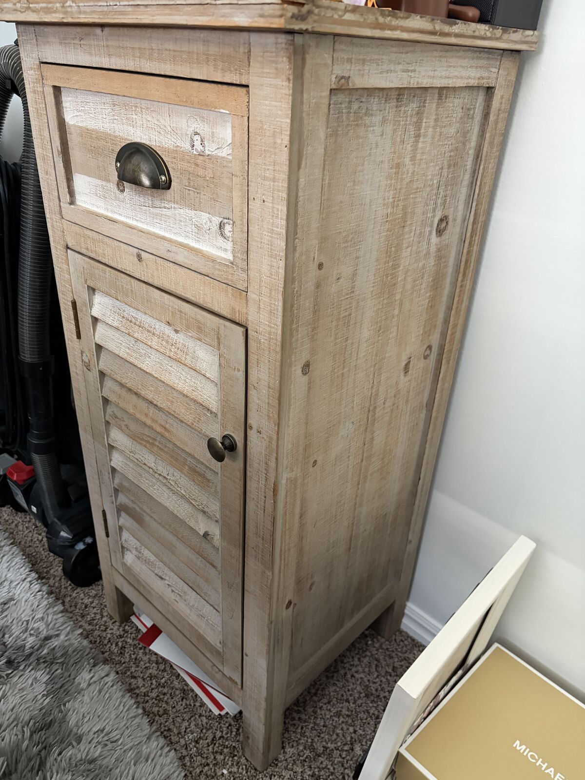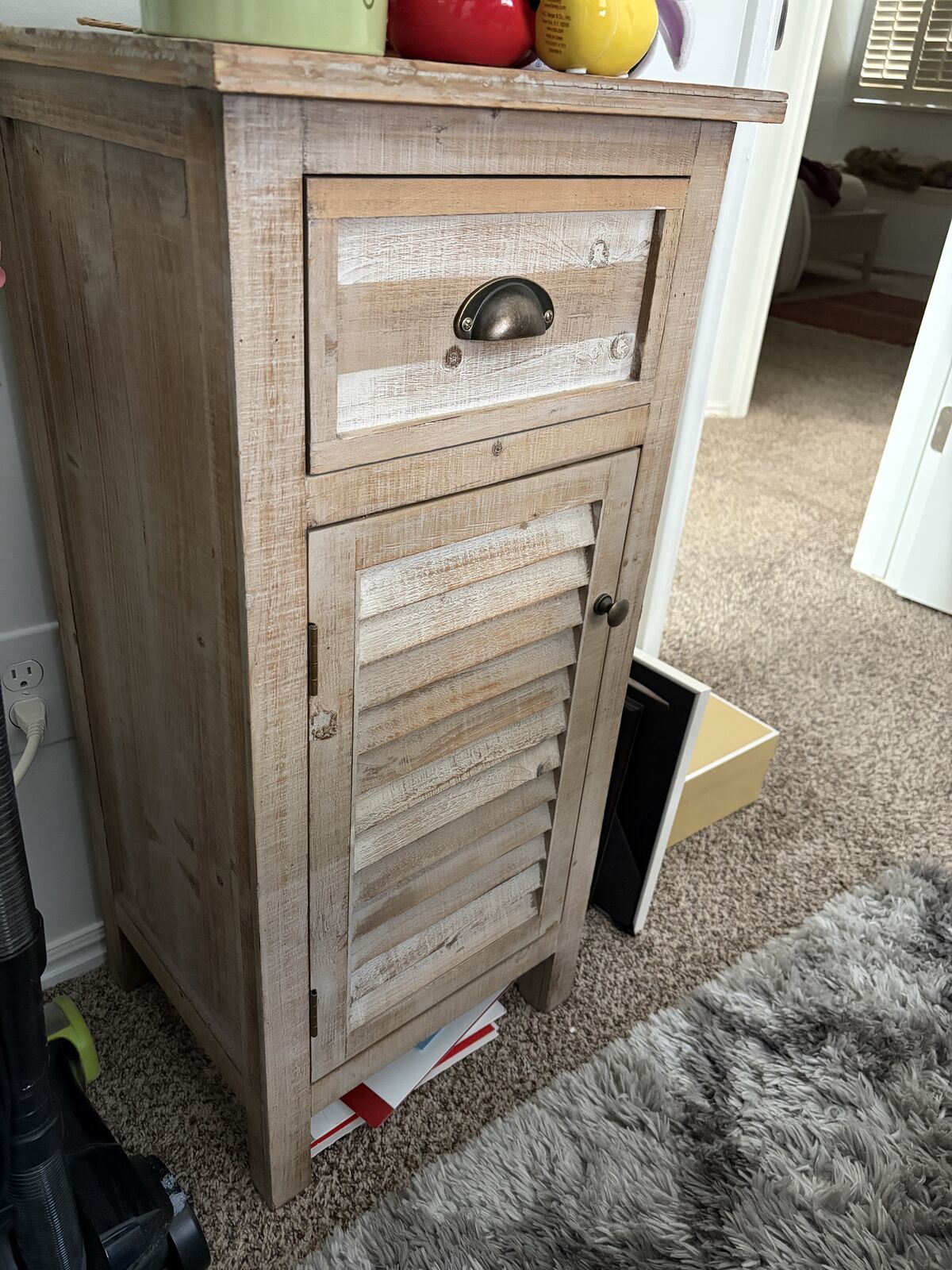 VenmoSmall Storage Chest with a drawer and two shelves in the bottom door. L 16x W 14x H 34 very very light wear and tea.
