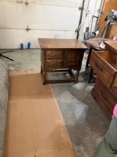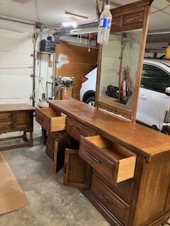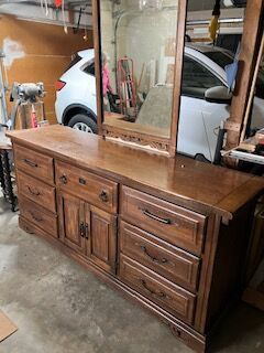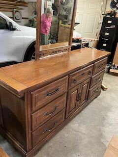 PayPalAn old, heavy, solid wood dresser and night stand, 75" long and 80" tall with mirror. It is clean and has all the drawer slides and handles. I refinished the top and repaired all the drawer slides. Bring friends and a truck. This is not cheap Ikea, or pressed board.