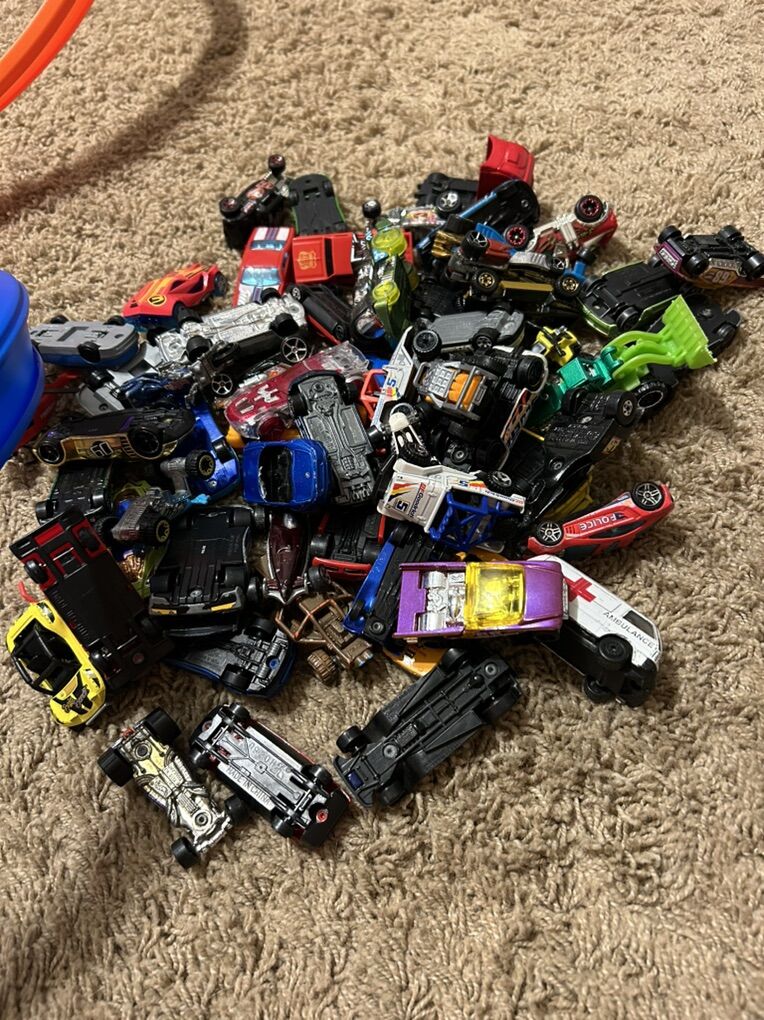 My son wants to sell his barely used hot wheels track as well as 60 vehicles. (Some are hot wheels and some are Mattel. Some of the hot wheels ones don’t work on the track and some Mattel ones do work so it just depends on the car but there are many in this lot that will work) There are also train, helicopter, ambulance, motorcycle, tractor, semi truck etc. Sold all together. The track alone costs $50 new (pic)