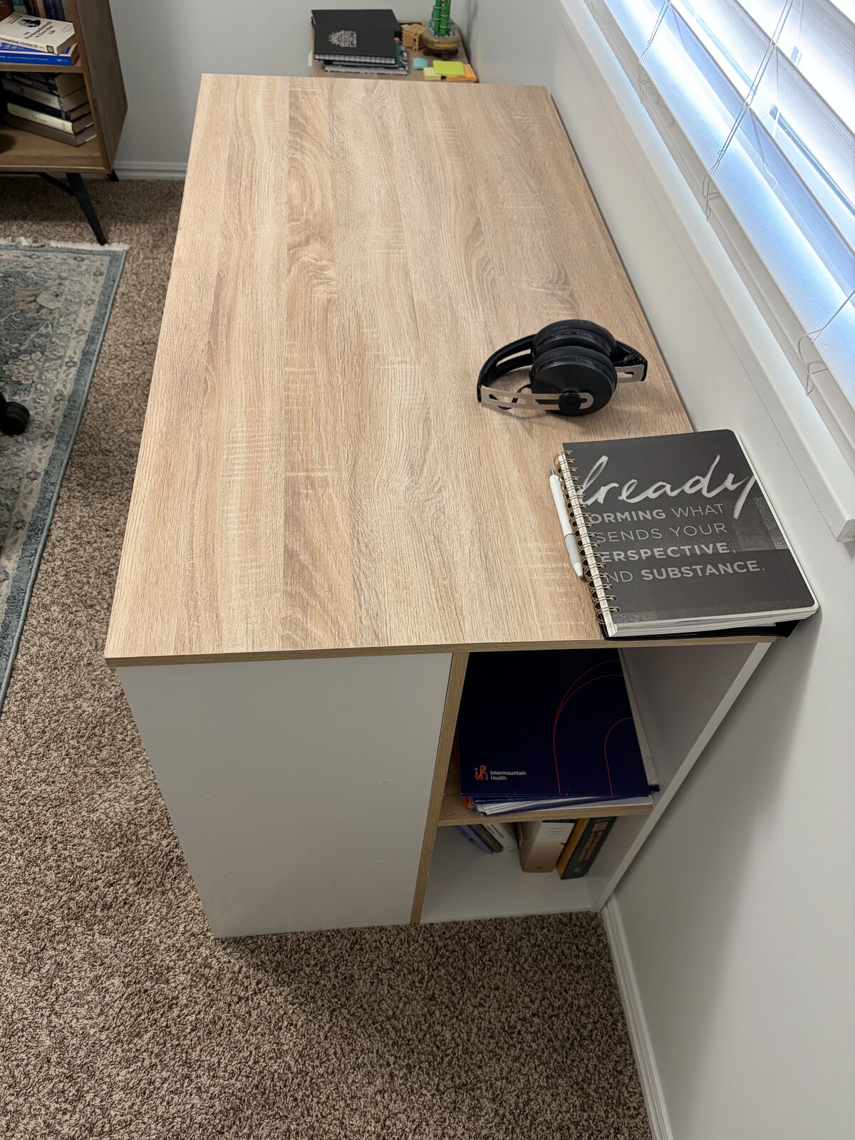 VenmoOffice Desk with some storage shelves. Good condition with some light wear and tear. L 47x W 24x H 29.5