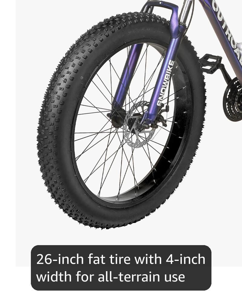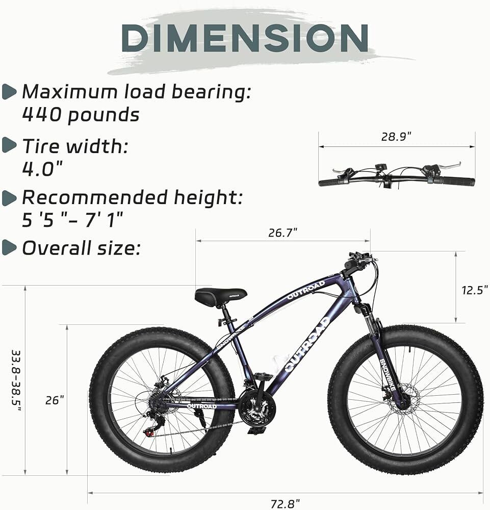 From online: “ • 21-SPEED - Compared with 7-Speed, 21-Speed can improve speed better. Outroad mountain bike can improve the Speed faster, change the Speed accurately and save more effort for uphill riding. • SHOCK ABSORPTION DESIGN - OUTROAD all-terrain MTB uses shock-absorbing front fork, and the thickened outer wall is more shock-resistant. Thickened shock absorber helps to absorb shocks, which can greatly improve ride comfort. • STURDY FRAME - This all-terrain mountain bike uses a high-carbon steel frame that combines quality and performance to resist deformation and stretching. The ergonomic design greatly improves the comfort during riding. • 4 INCH FAT TIRE - Width up to 4 inches, 5 times more wear resistance than ordinary bicycle tires. Strong grip and anti-skid, fully able to challenge any terrain, conquer any off-road trails and urban roads.”