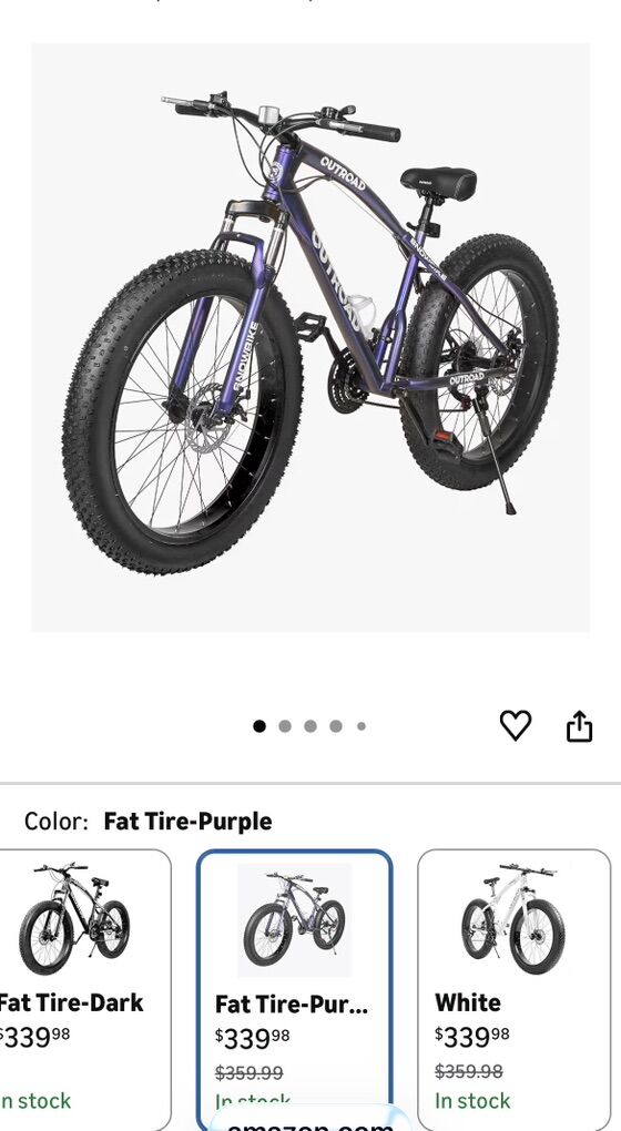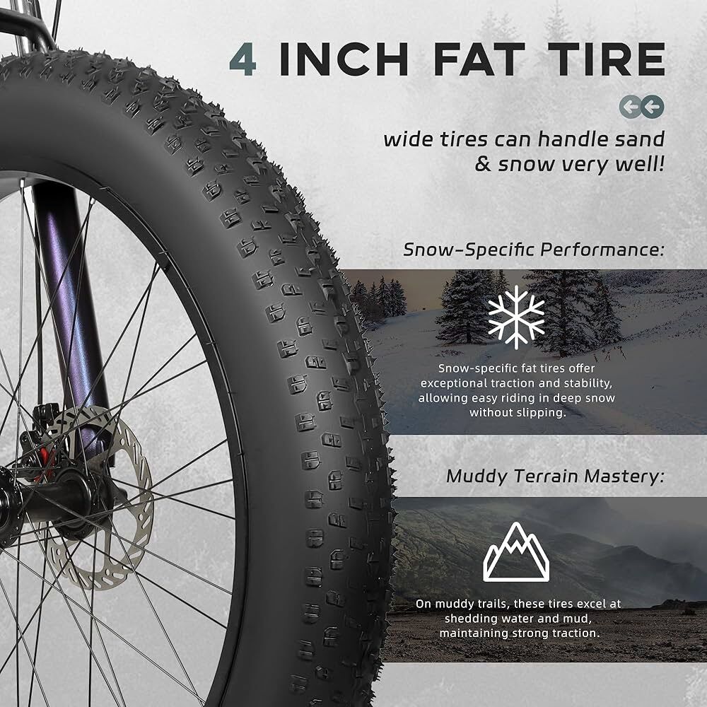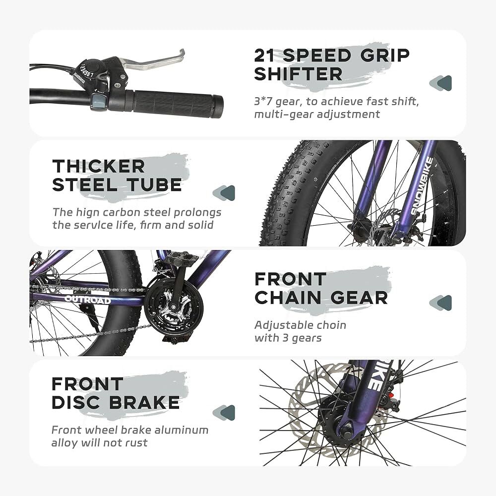 ZelleNew purple Outroad fat tire mountain snow bike with 26 inch wheels and massive 4 inch wide tires. Brand new, never used or ridden so it hasn’t been tested or adjusted yet, but it’s fully assembled and ready to ride.