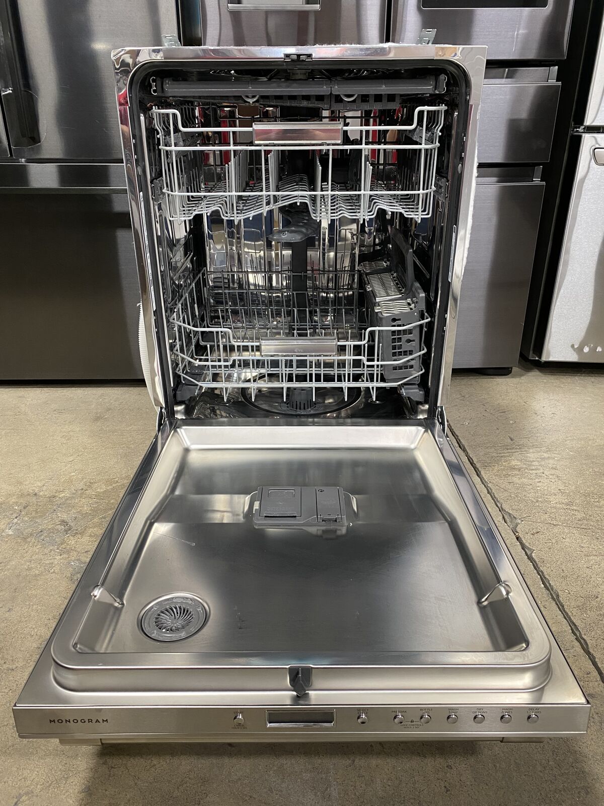 Monogram Statement Series 24 Inch Fully Integrated Smart Dishwasher with 16 Place Settings, 7 Wash Cycles, Hard Food Disposer, Advanced Wash System, Deep Clean Silverware Jets, Bottle Jets, Max Dry, LED Lighting, Sabbath Mode, and ENERGY STAR® Certified: Stainless Steel, Statement Handle #N1022