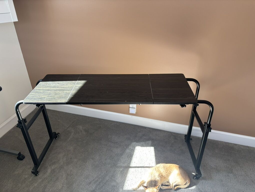 Adjustable; fits all bed sizes. Sturdy and held a laptop, books, and desktop computer while needed for recovery from injury. Used gently for 1 month, like new!