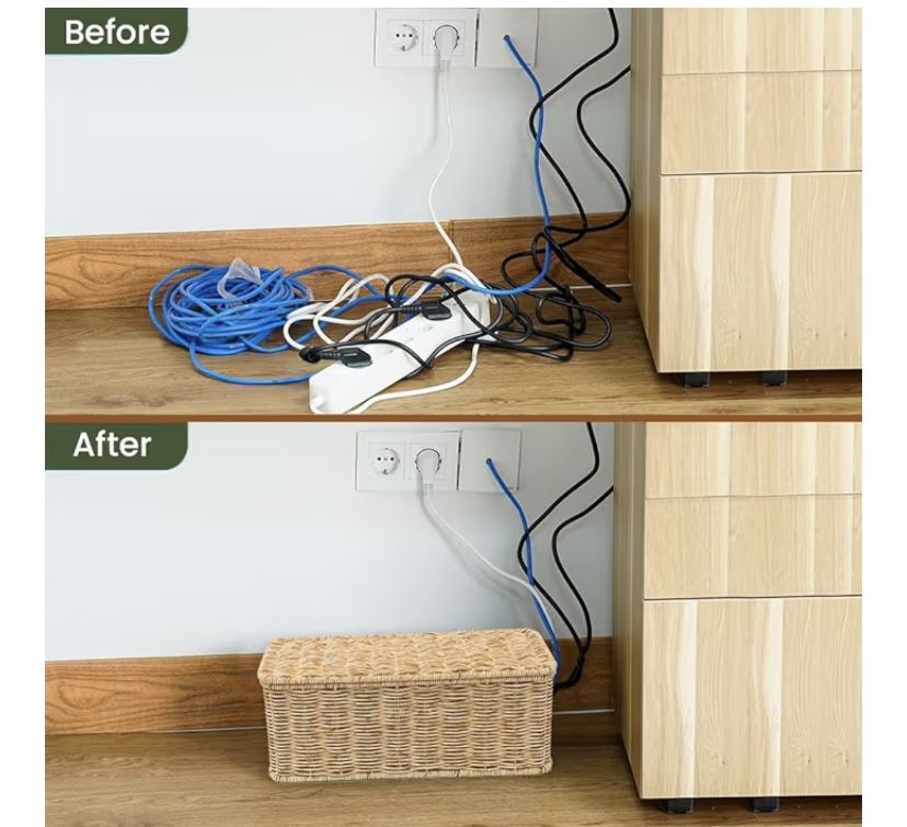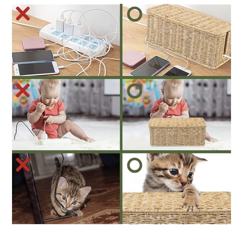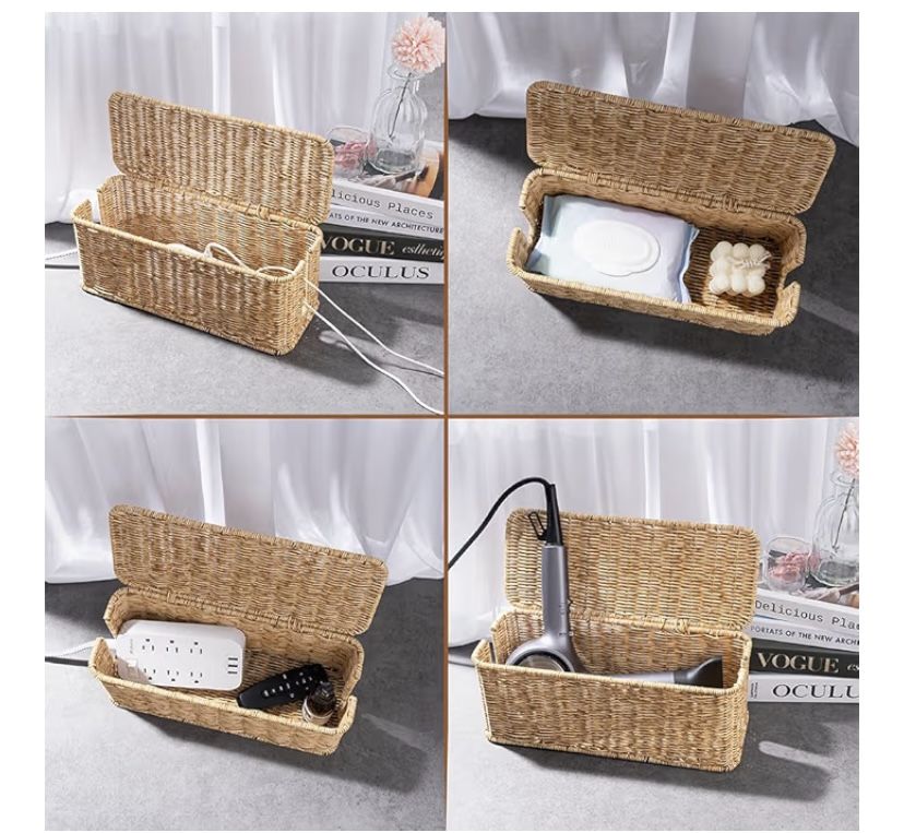 VenmoCalble management cord box/cord hider for power strip, natural color and decorative very nice and strong handmade organizer perfect to organize your cords and looks very nice for decoration and protect your pets and kids, I have two of them as you see in the pictures $20 for each. (U.S. Design) made with strong materials *plastic and metal* please look at the photos for measurements.