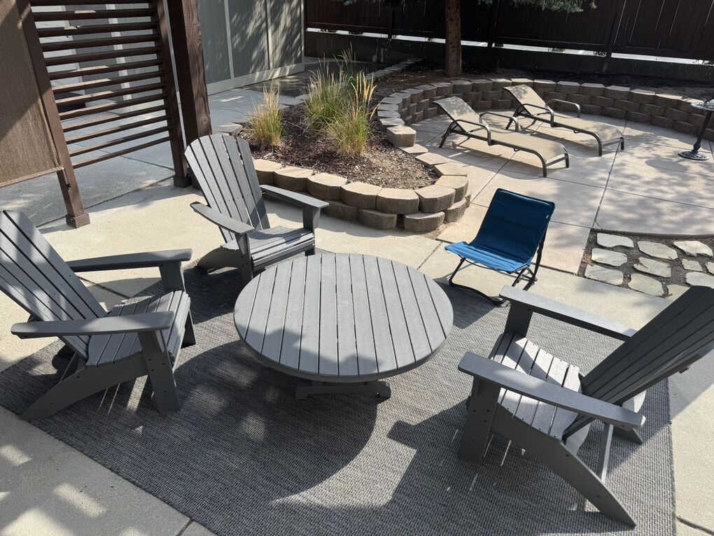 (3) Nautical Curveback Adirondack Chairs, Slate Grey, (1) 48” Round Conversation Table. Excellent condition. Pickup only. Set retails for $1300.