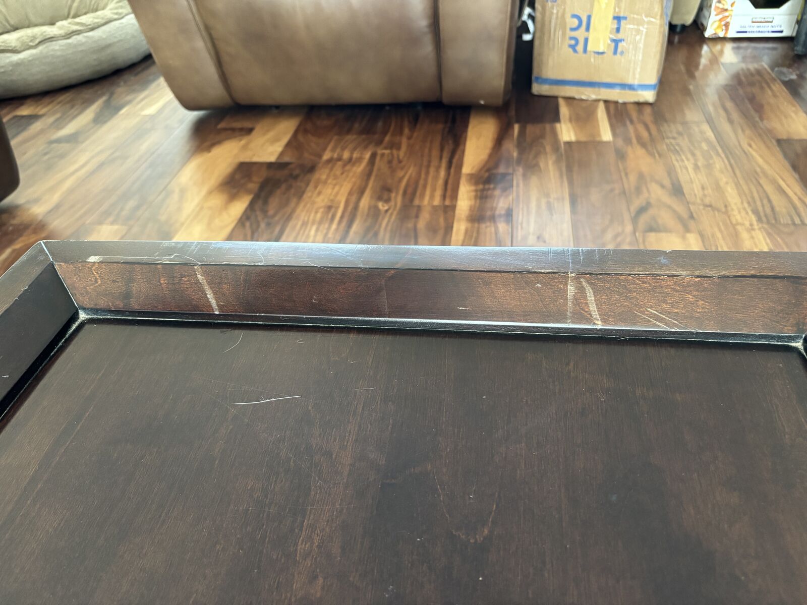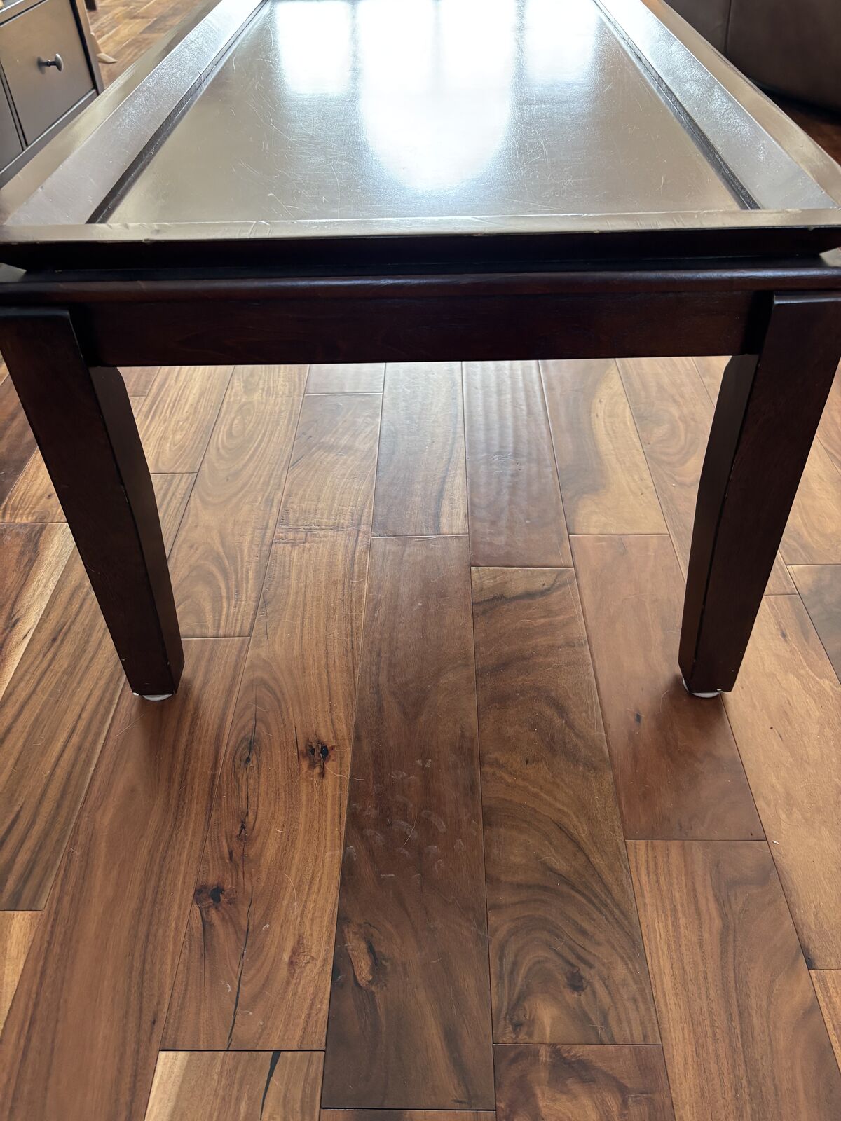 ZelleWooden coffee table 47.5” L x 23.5” W x 18.25” H. Scratches and chips as seen in photos. For pickup only
