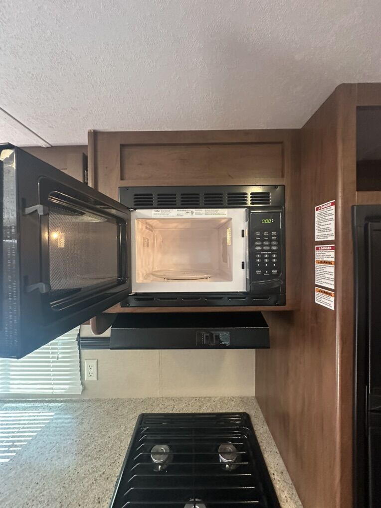 Full kitchen with fridge, microwave, 3-burner stove, and oven