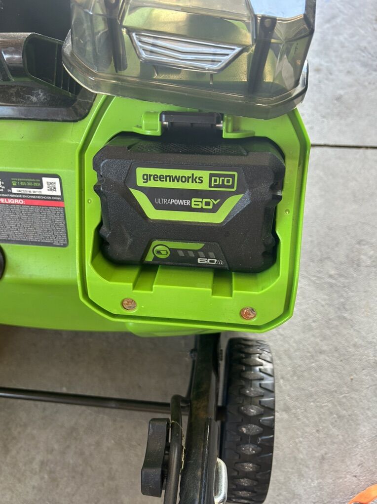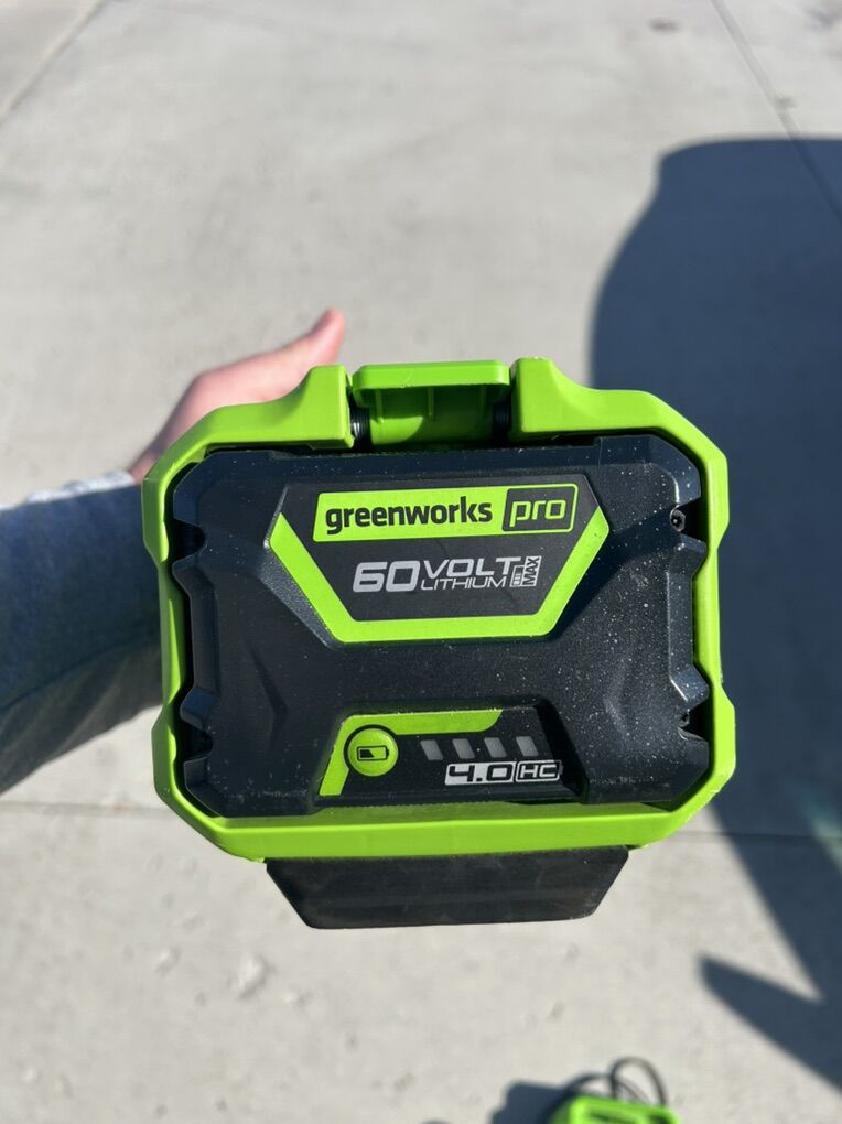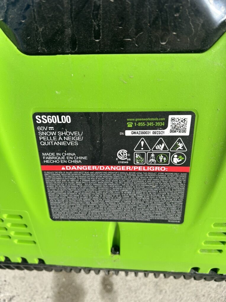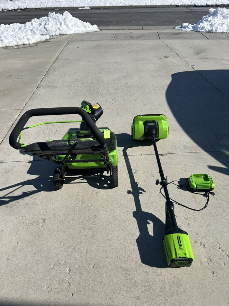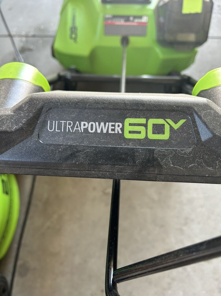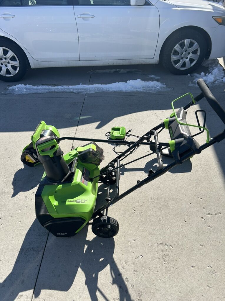 Green Works brand 60 V snowblower and green Works power shovel with 60 V battery. Comes with two 60 V batteries and a charger. The cover for the battery is stuck on with tape.