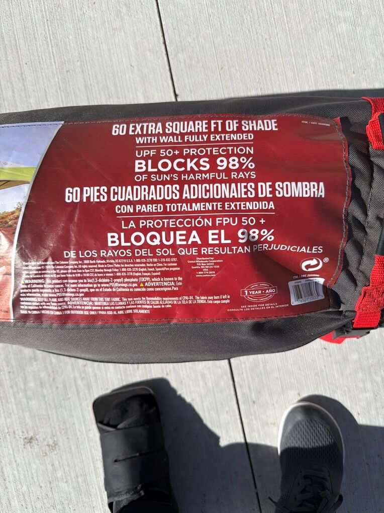 Coleman swingwall instant canopy shade area 100 ft. I can’t recall us ever using it. I think it’s brand new. I don’t know how to set it up so it’s what you see, which is brand new.