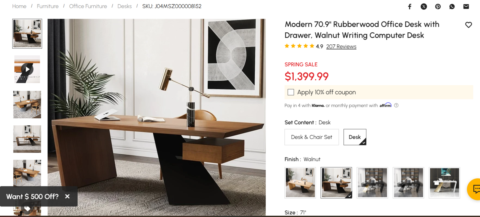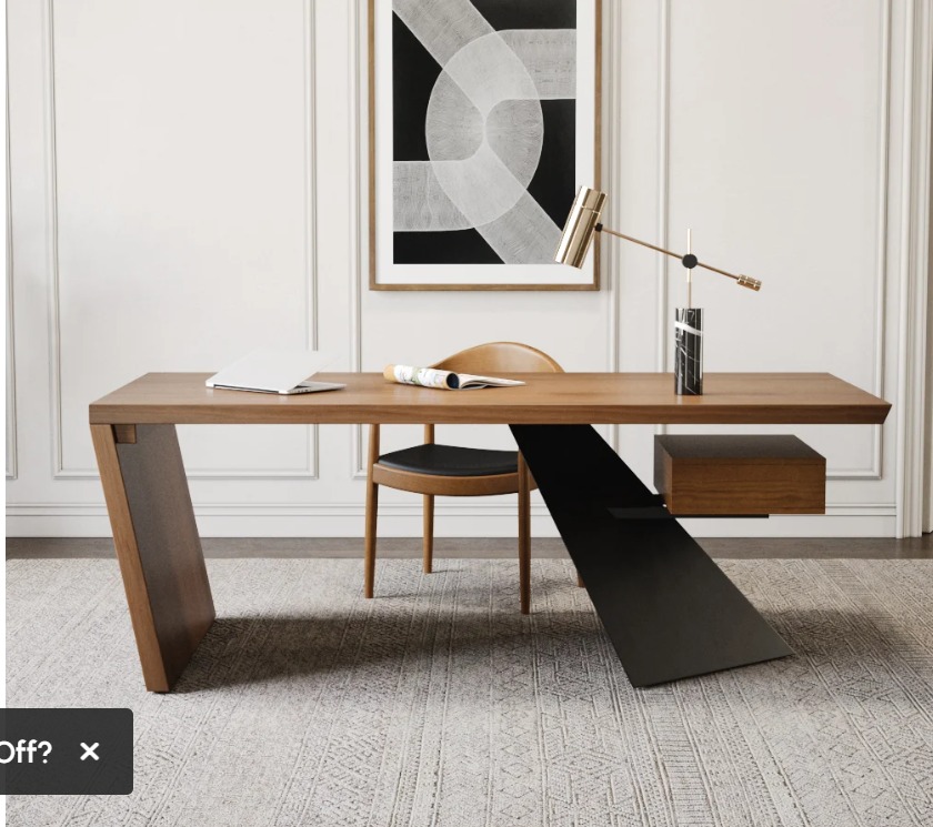 Elevate your workspace with this 71" modern solid wood desk featuring a warm walnut finish. Crafted from rubberwood and wrought metal, its architectural design includes a floating drawer and shelf for strategic storage. Perfect for executive offices or home studios seeking minimalist style.