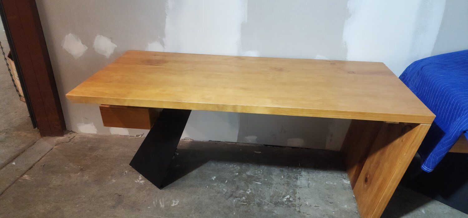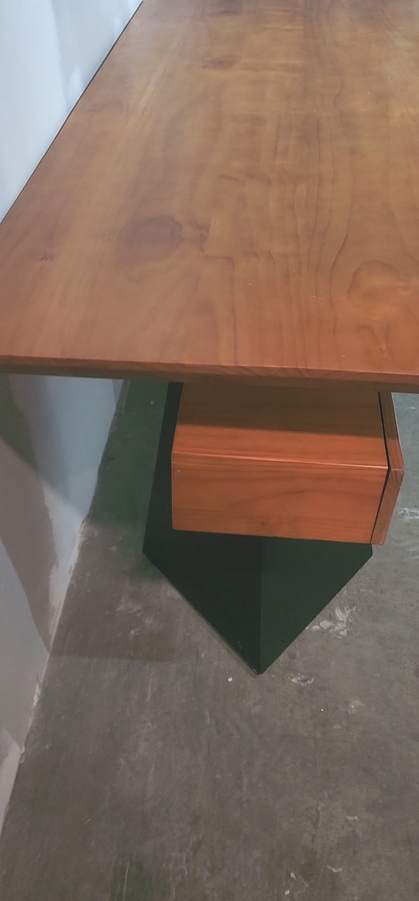 Solid wood construction: Rubberwood top resists warping while developing richer character over years of use. Floating storage system: Drawer conceals clutter and open shelf displays decor within easy reach. Triangular metal legs: Geometric base provides exceptional stability during intense work sessions. Moisture-resistant finish: Protective coating safeguards against spills and humidity damage. Modern architectural design: Clean lines and angled supports create a gallery-worthy focal point. Quick partial assembly: Pre-attached components reduce setup time to under 20 minutes.