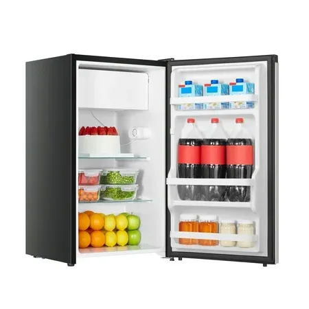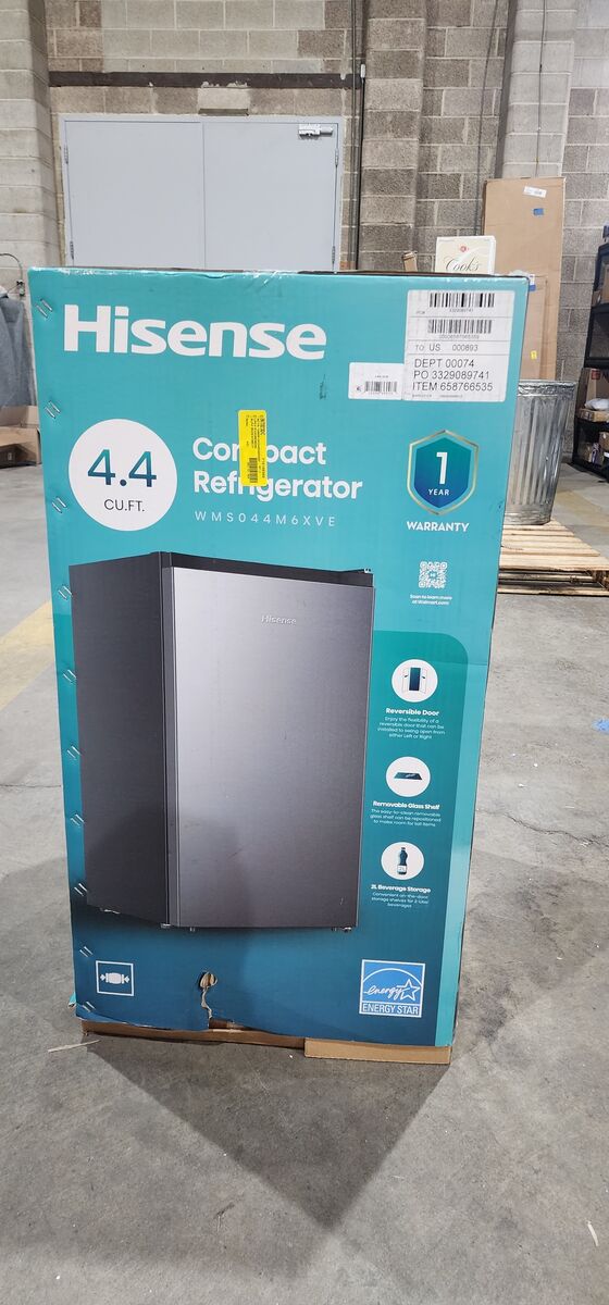 New From Hisense 4.4 Cu ft capacity Adjustable temperature control 2L Bottle Storage Adjustable Legs 2 Tempered Glass Shelves Reversible Door E-Star Rated Includes Chiller Compartment Silver Color Single Door Model WMS044M6XVE 18.7" Width
