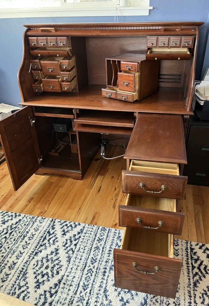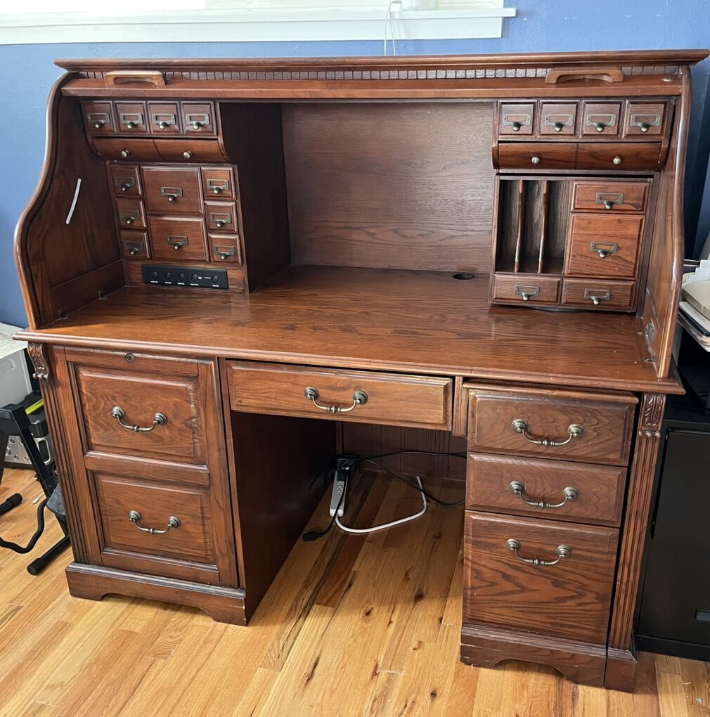 VenmoGood condition. Lots of drawers and a cabinet. Two drawer sections are removable so you can configure the desk how you like. Two pull out trays. 4ft 9in long, 2ft 9in wide, 4ft 5in tall.