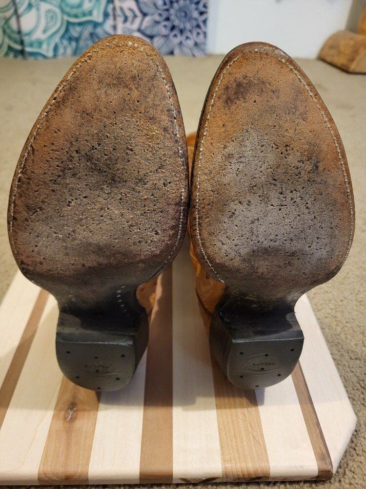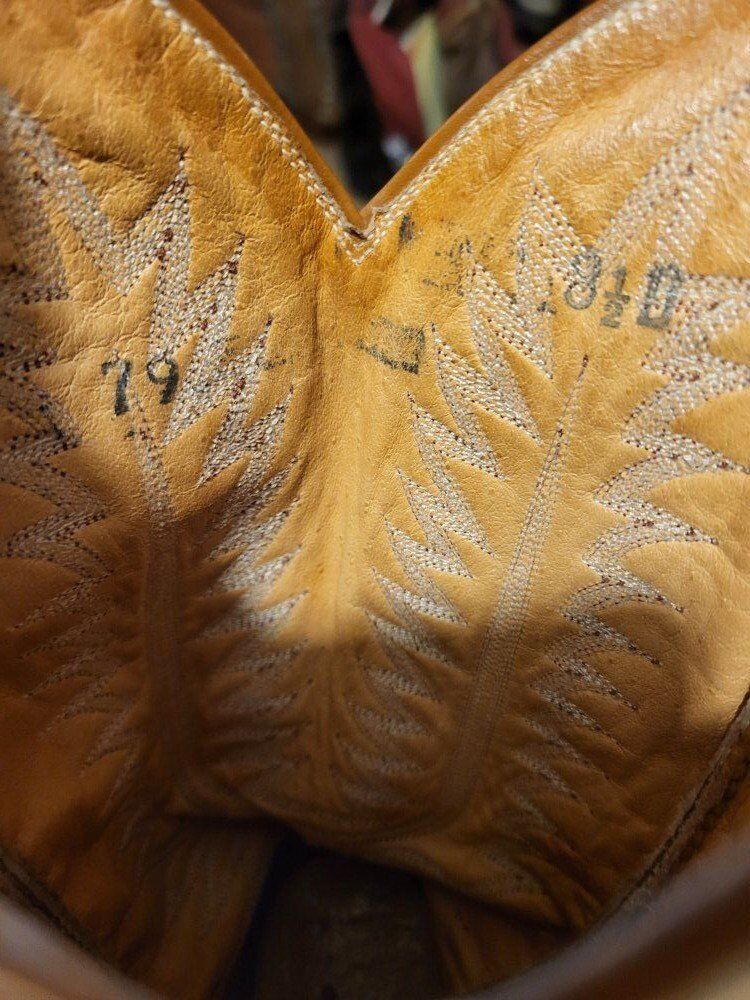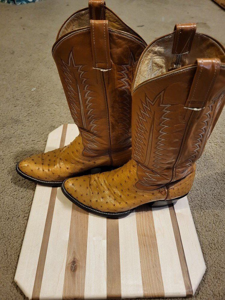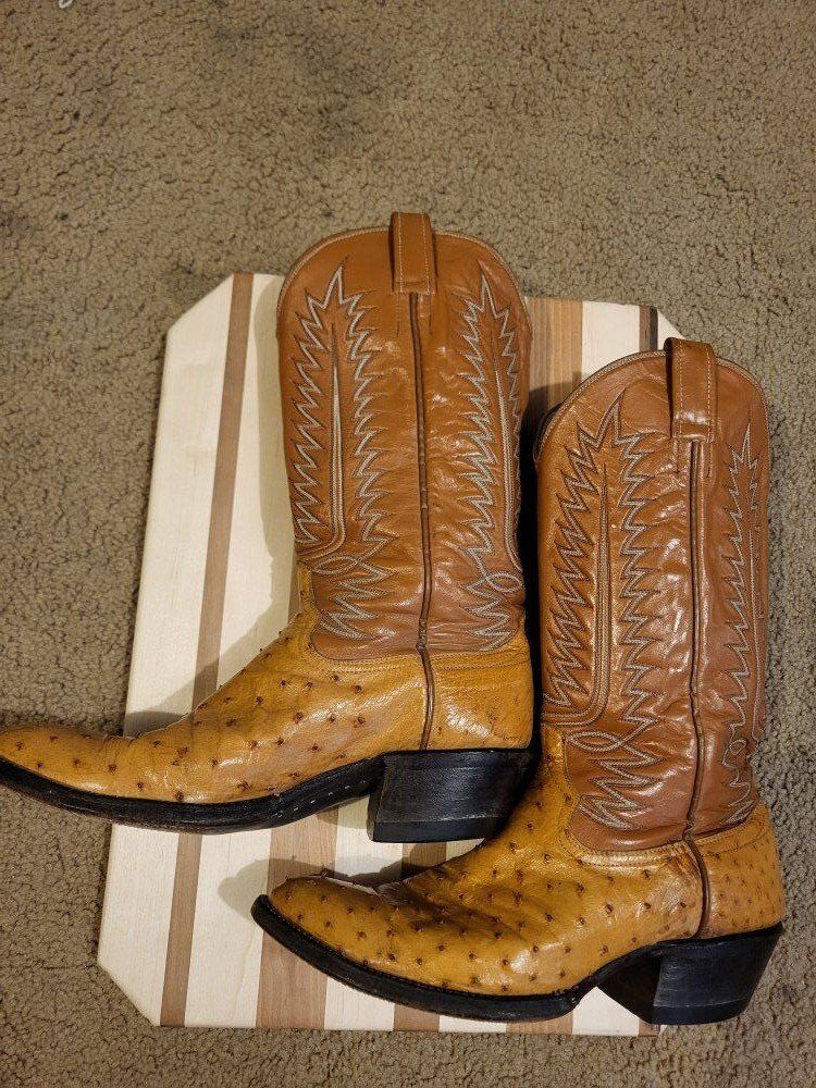 Vintage ostrich skin cowboy boots, not sure what brand but I would guess Tony Lama or Nocona. Mens Size 8 1/2 D. They're in decent shape with no rips or tears. Im guessing they have been resoled before but outsole are in good shape with some wear and no holes. They have a traditional single stitch welt, leather outsole, and a leather insole.