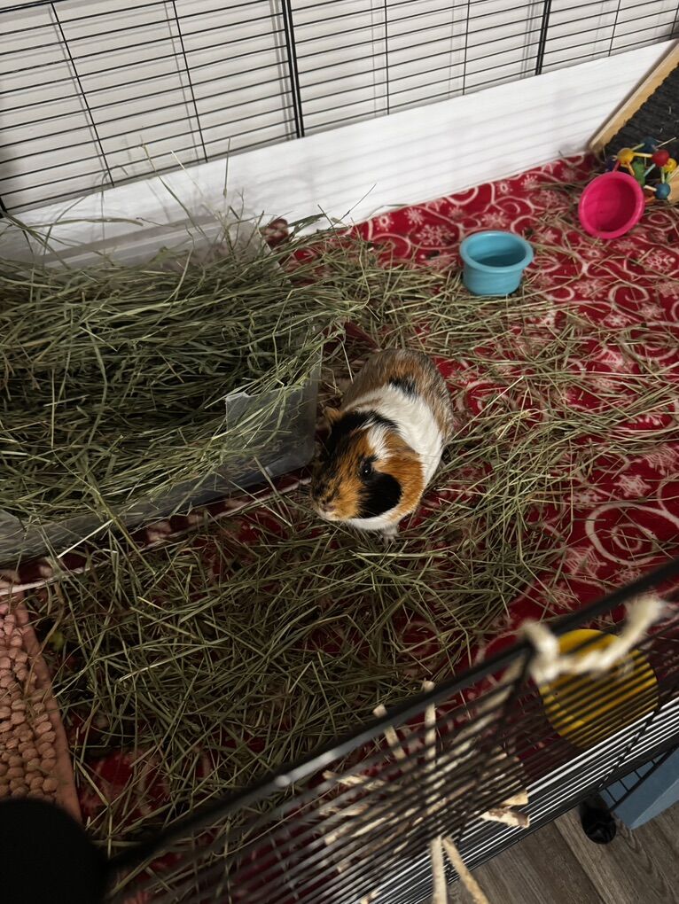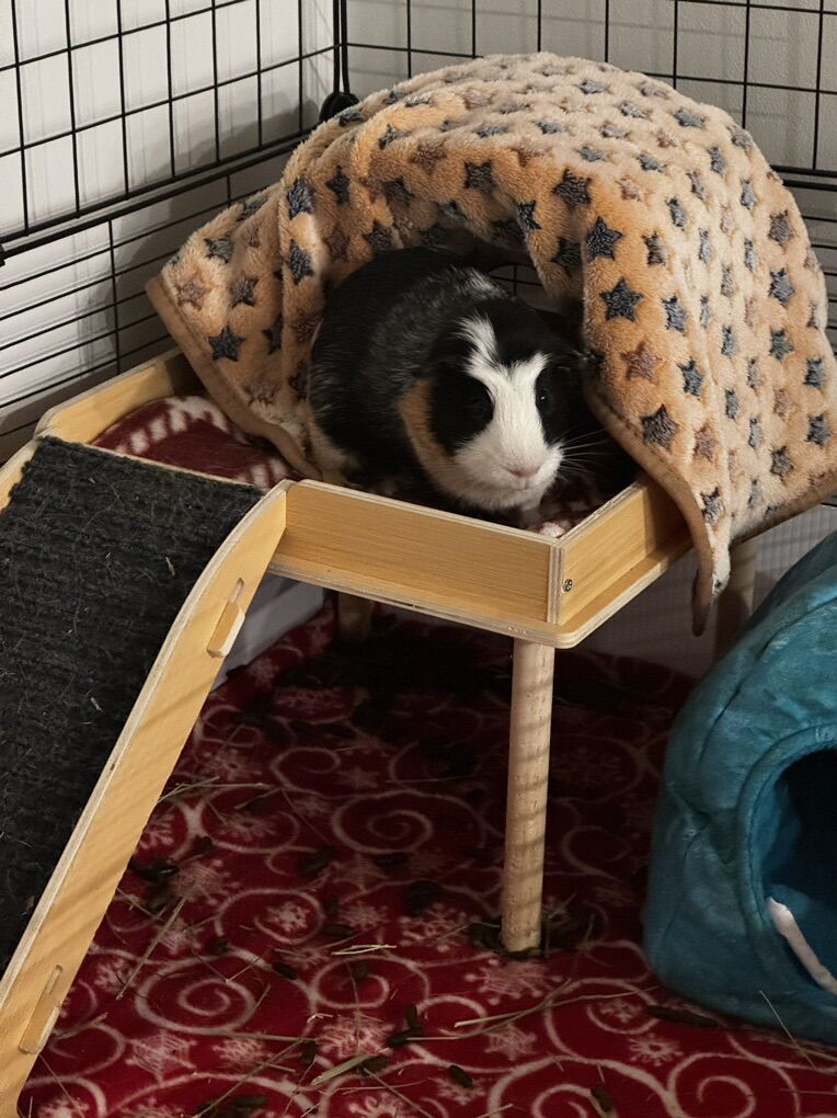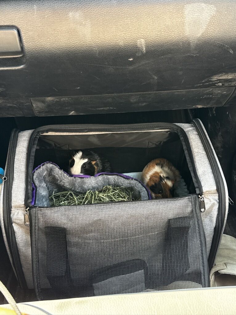 Venmo2 male guineas pigs. They are about 8 months old and I have had them since they were about 6 weeks old. They are sweet, I am just allergic and can no longer care for them how I would like. Their cage is a C&C cage and can be made bigger or smaller. I have extra panels and connectors to include as well. I have sewn a few waterproof cage fleece liners that can be washed and reused. There are blankets, other waterproof pads, a wood platform with a hammock underneath (I have also sewn waterproof pads for the top), a hand sewn hidey hut with a waterproof liner, a log tunnel, a fleece tunnel, and a few other accessories. I also have a play pen with fleece waterproof blankets for them to play in as well. I also have a pet carrier I can include. I also have extra hay, pellets, and veggies you can take as well.