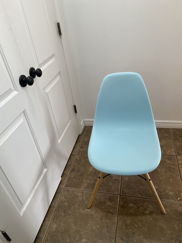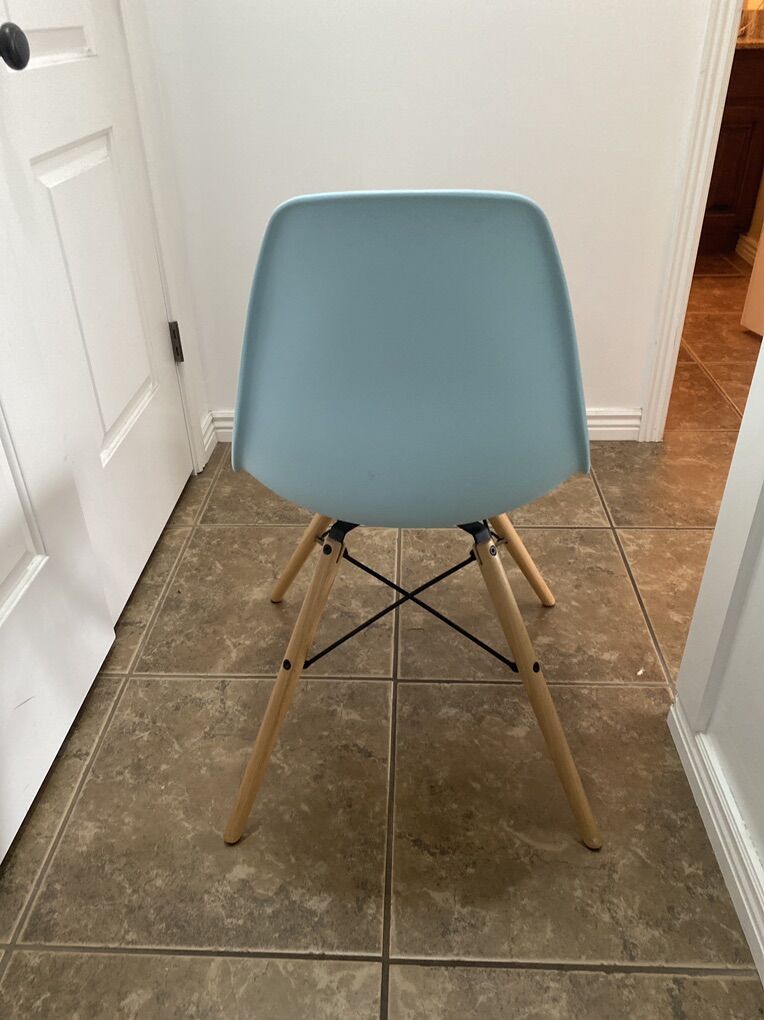 VenmoStylish modern molded chair in light blue with natural wood legs and black metal supports. Comfortable and sturdy. Great for dining room, desk, bedroom, or accent seating. • Modern / mid-century style • Molded plastic seat • Solid wood legs with metal supports • Clean and well cared for • No cracks or damage Pickup only. Cash preferred. Message if interested.