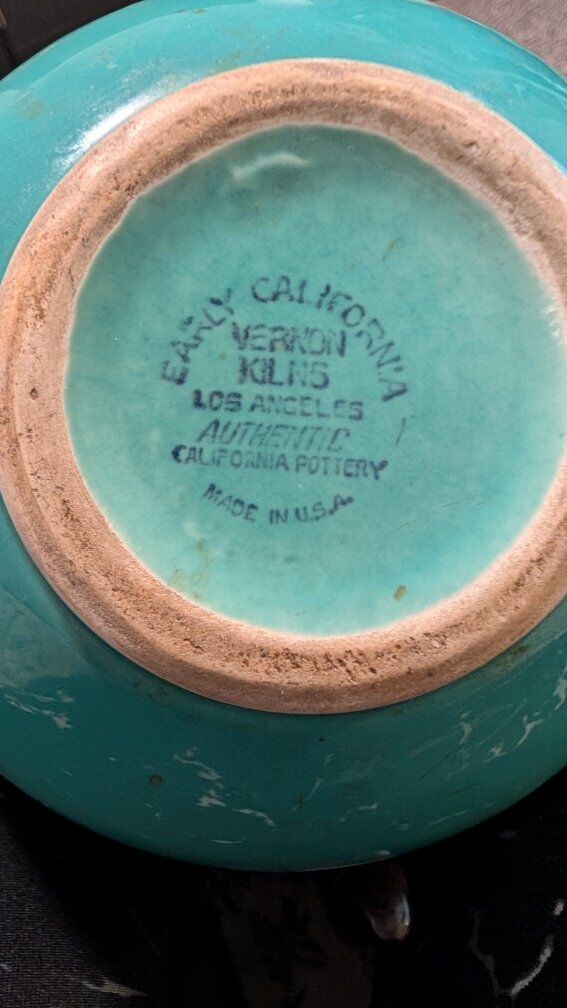 This item is a vintage Vernon Kilns "Early California" pottery carafe in a teal or turquoise glaze, likely produced in the late 1930s or 1940s. Material: It features a ceramic body with a dark Bakelite handle secured by a metal band. Dimensions: It stands approximately 8.5 inches tall. Has a small chip at the top rim. Text if interested. Asking $10.00