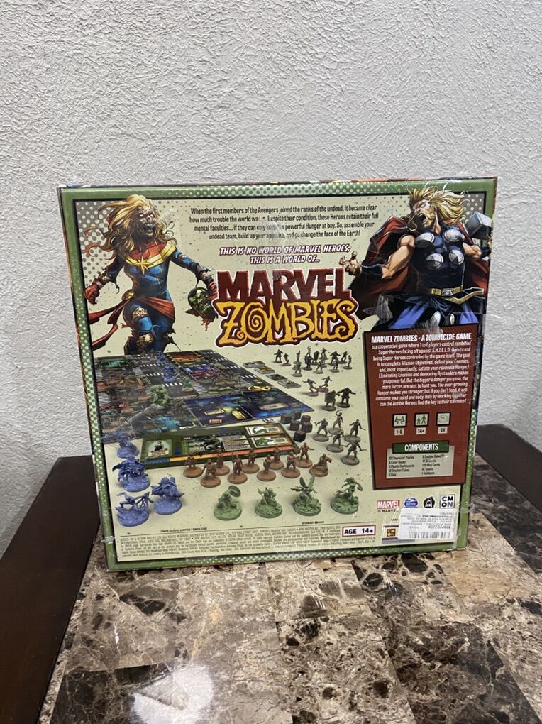 This is a cooperative board game, featuring iconic Marvel heroes turned into zombies. Players: Designed for 1 to 6 players. Objective: Players control zombified superheroes to complete missions, defeat enemies, and devour bystanders to satisfy their hunger. Components: The core box includes 87 character pieces, nine double-sided game tiles, and various cards and tokens. Recommended Age: Suitable for ages 14 and up.