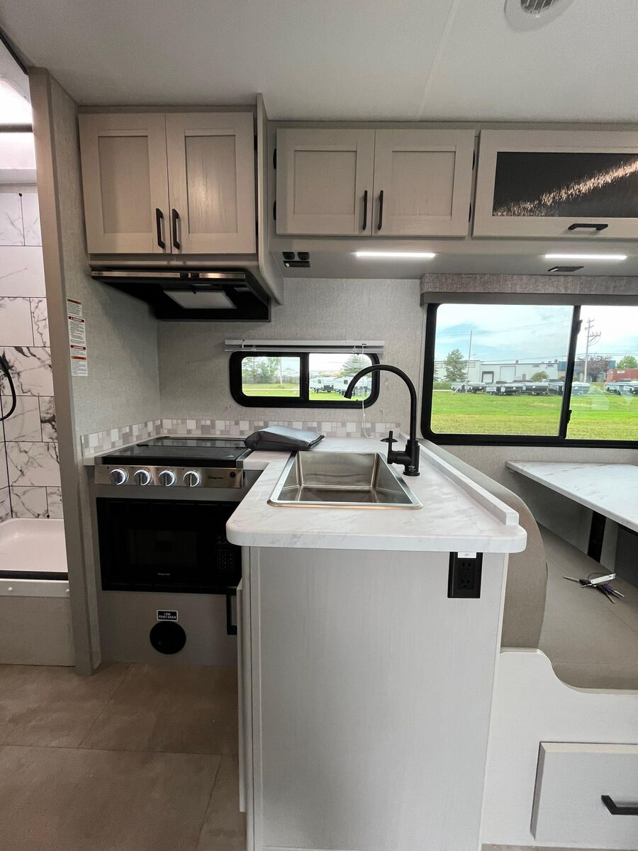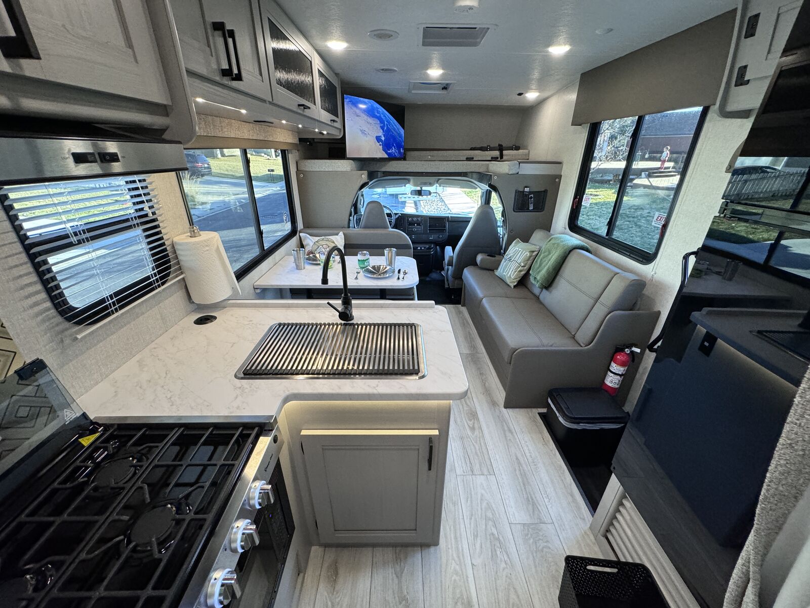 Experience the ultimate road trip with our Coachmen 27QB Motorhome. Perfect for families and groups, this motorhome sleeps up to 6 with a master bedroom, queen bed above the cab, convertible dinette, and cozy sleeper sofa. Key Features: