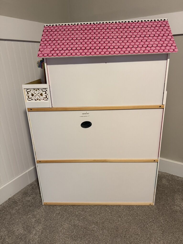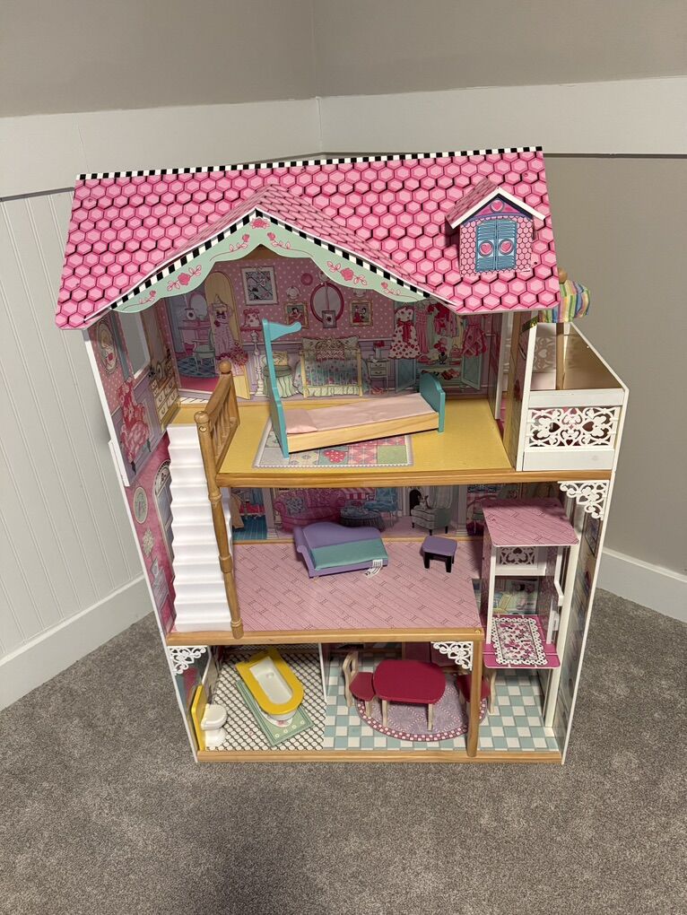 ApplePayGently loved and ready for a new home Super fun 3 levels, 4 rooms and a balcony Gliding elevator with handle for easier movability Made of wood Fits dolls up to 12 Barbie, L.O.L. Surprise!, Disney Princess, etc.