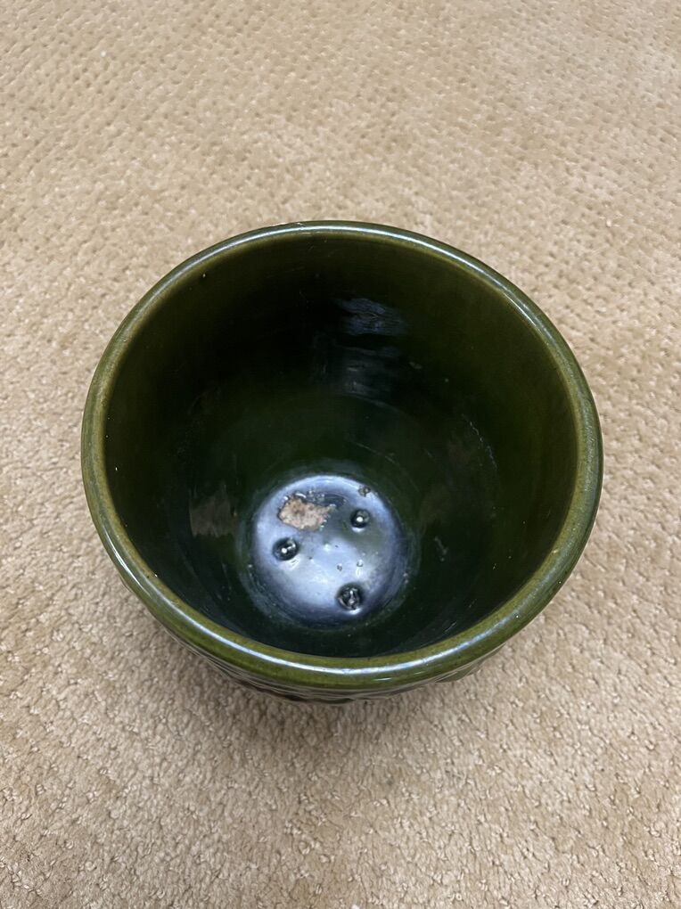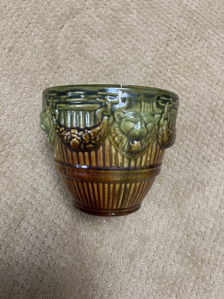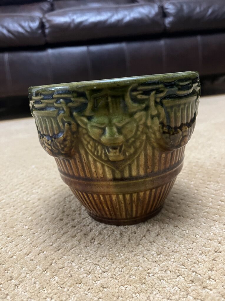 This is a beautiful example of pottery from 1900-1920's. It is the drip glaze design that starts at the top with a olive green color, the middle is a light gold and the bottom is a darker gold. The pattern has lion heads with a floral swag. The glaze is a gloss. It measures 5 1/2 inches tall x 6 1/2 inches wide. It is 3 1/2 inches at the bottom. The only mark on this is a number 249. There is a glaze skip Inside the pot at the bottom as shown in the pictures. There is a small scratch on the outside. Also shown in the pictures. It is a very old piece so the wear is consistant with age and use. Selling for a parent. Price is firm.
