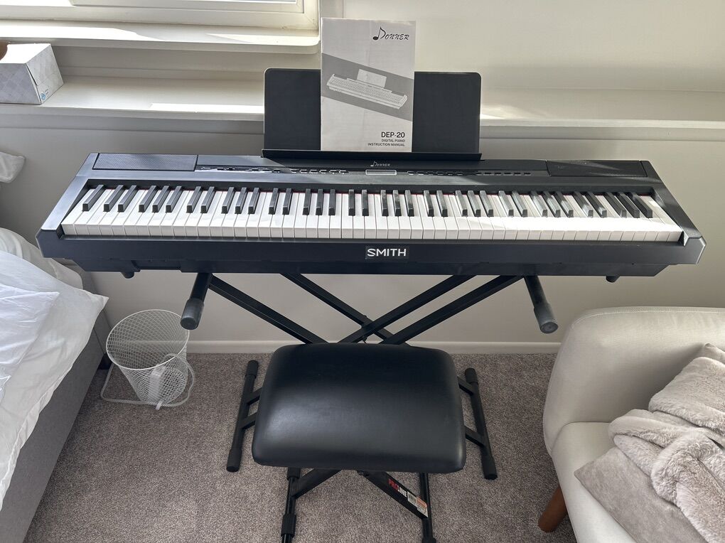 I got this as a starter keyboard and it got some use for a year or so but now it has been sitting not being used. I bought it because the keys feel similar to weighted keys and they have a great feel to them. They keys are in great shape, no sticky or broken keys and still plays great! Comes with stand, bench, and pedal. Original price when new was around 400.