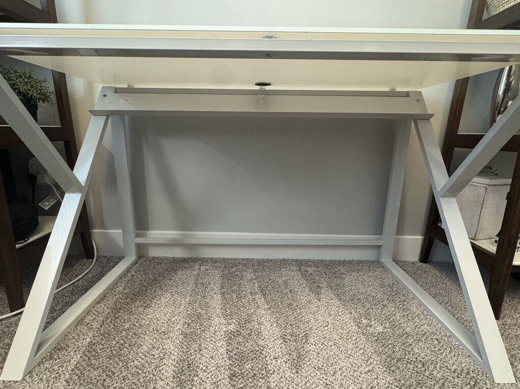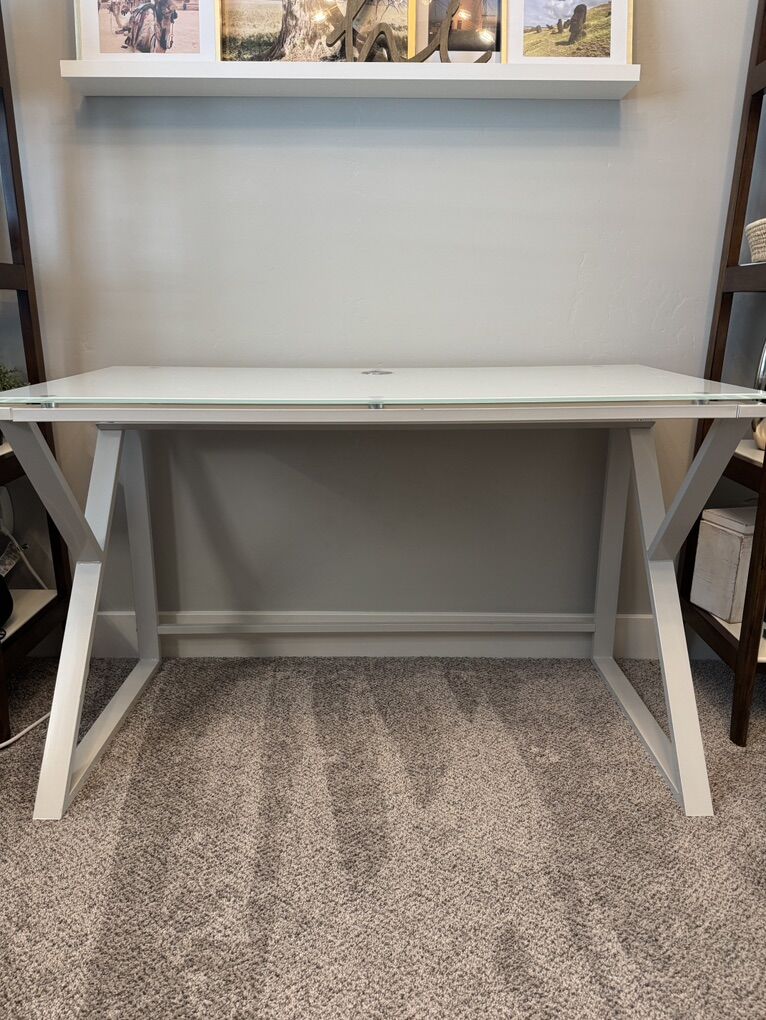 Nice white metal desk with glass top and cord management. 48” wide by 24” deep by 29” tall. Very sturdy metal desk, with clean and modern lines. In great shape. The pass-through on the top of the desk leads to a nice tray underneath to hold all the messy cords! Smoke-free home. pick up in Pleasant Grove Trying to move this quickly - Today only $40.