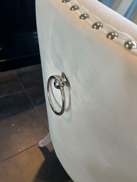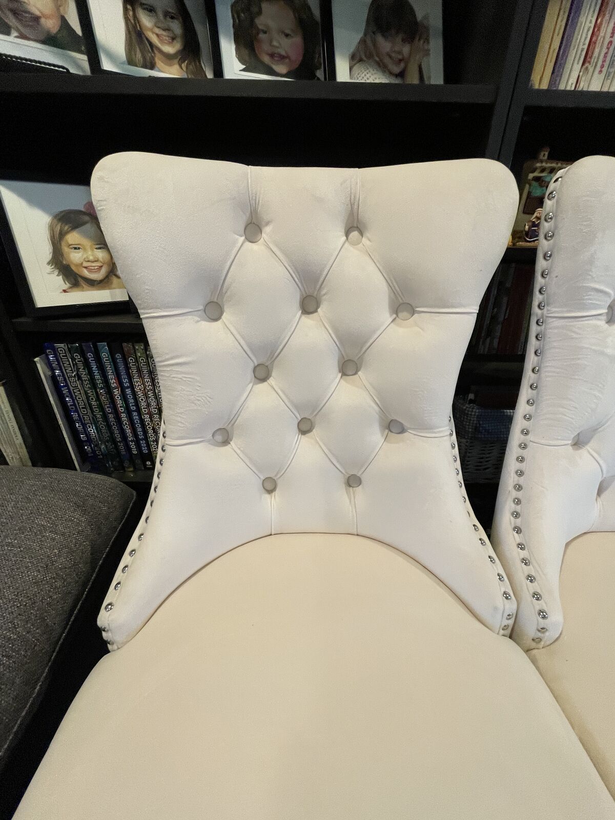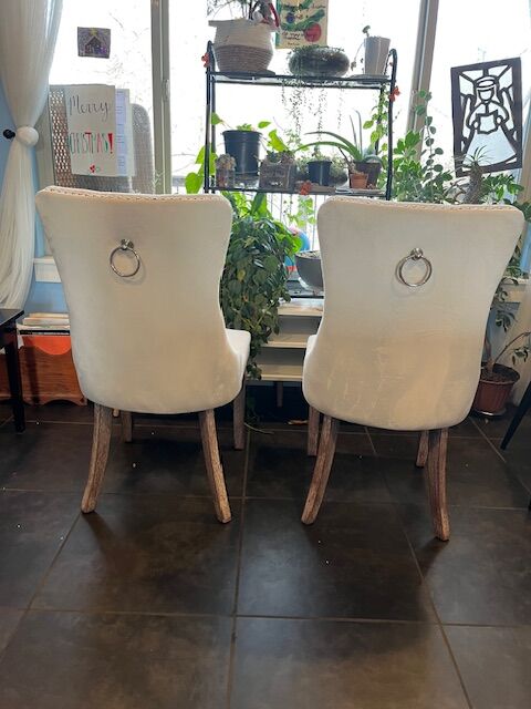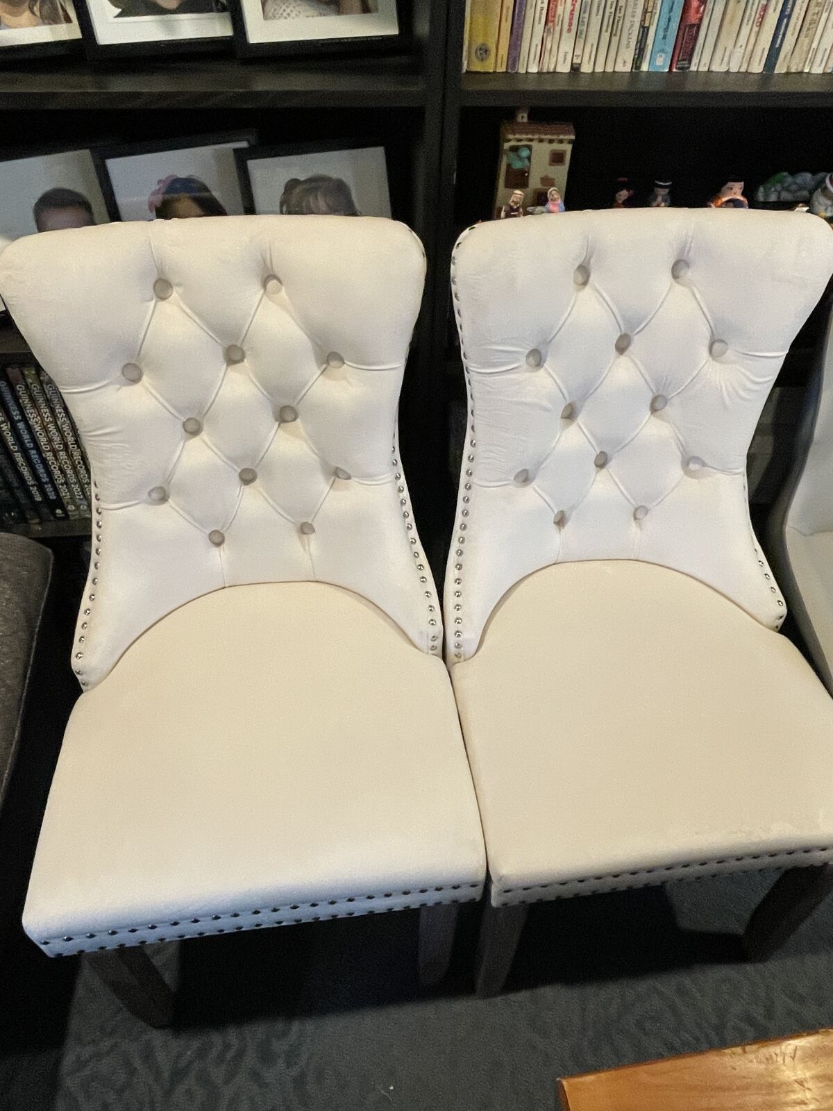 PayPalBeautiful set of two new upholstered dining chairs in a soft cream/beige fabric. These chairs feature a tufted back, decorative nailhead trim, and a stylish metal ring pull handle on the back for easy movement. The legs are a rustic wood finish that pairs perfectly with farmhouse, transitional, or modern décor.