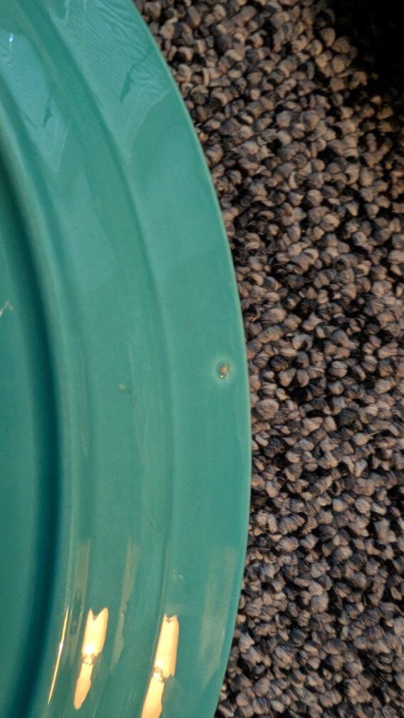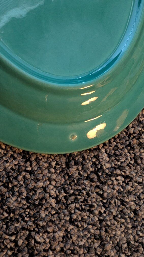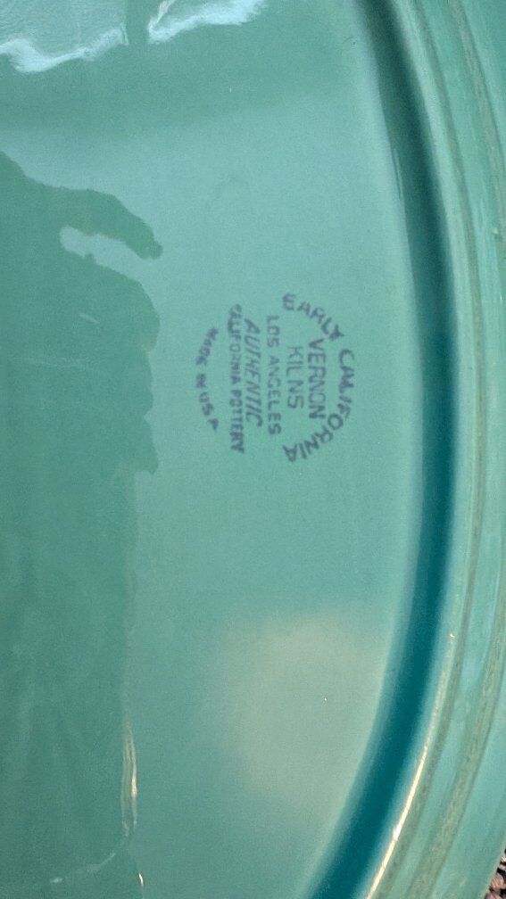 This Vintage Vernonware Early California Turquoise 12" Oval Serving Platter is a unique and collectible piece that embodies the charm of 1920s-1940s American ceramics. Made of ceramic in a classic oval shape, this original serving platter in a striking green turquoise color adds a touch of vintage elegance to any dining table or collector's display. With its timeless design and brand history, this piece encapsulates the artistry and craftsmanship of its era. There are a couple of tiny chips. Text if interested. Asking $10.00 each